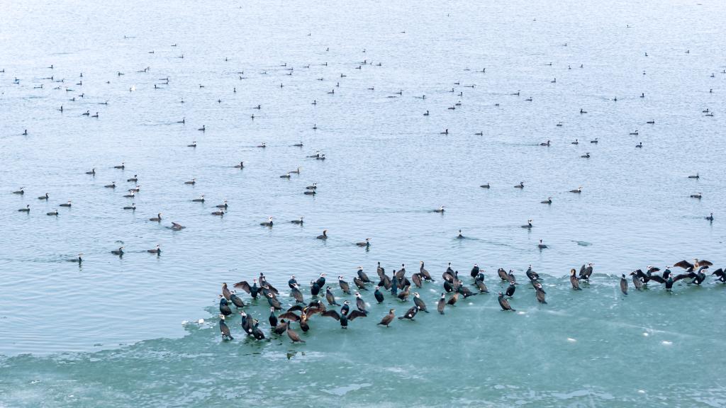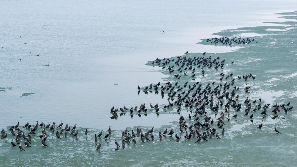 这是3月27日在松花江哈尔滨段一处水域拍摄的鸬鹚群(无人机照片)。新华社发(傅强摄)