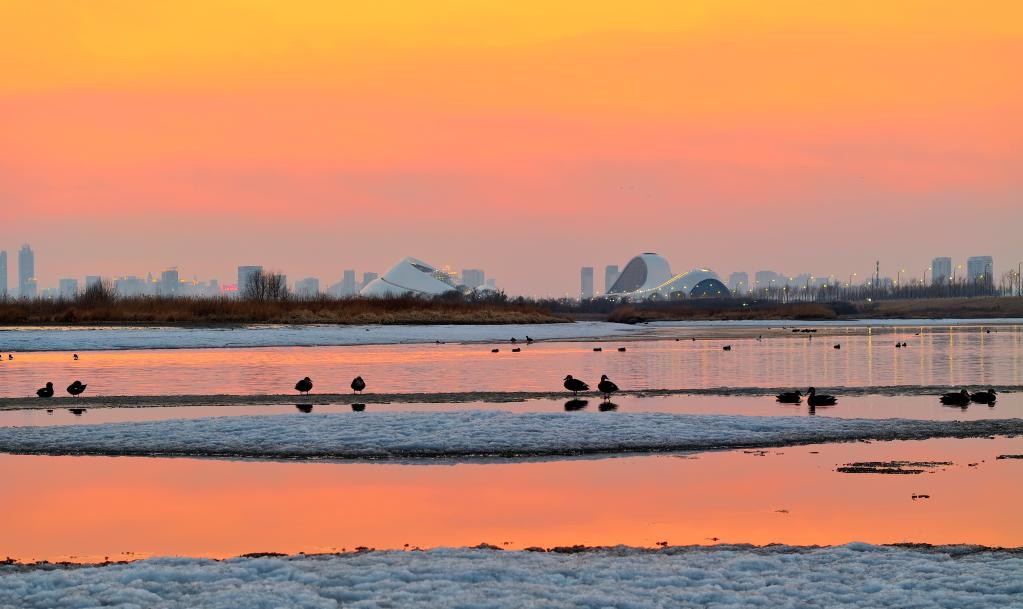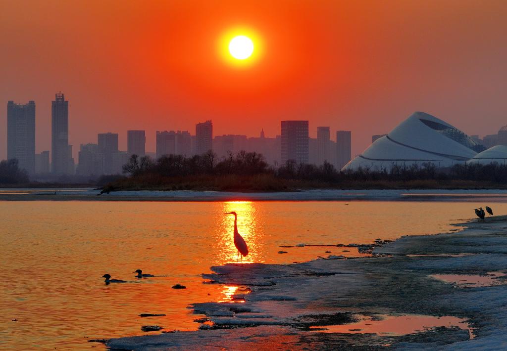 3月27日,候鸟在哈尔滨大剧院附近江面停歇(无人机照片)。新华社发(张树摄)