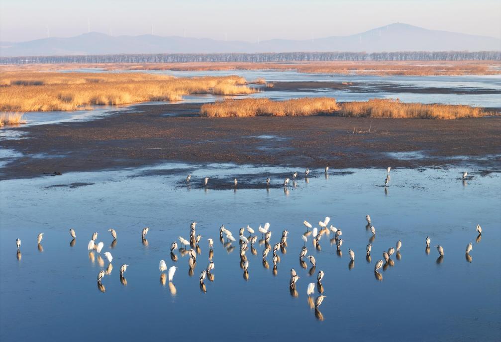 这是3月28日在黑龙江省富锦国家湿地公园拍摄的候鸟(无人机照片)。新华社发(曲玉宝摄)
