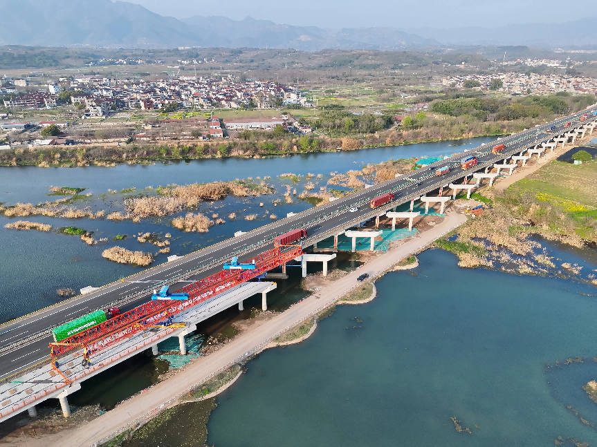 目前,项目全线136个工点同步推进,2000余名建设者坚守岗位,架桥机、隧道台车等施工设备全速运转,呈现出大干快上的火热态势。一季度项目捷报频传,关键节点接连突破:1月11日,嵊张线跨线天桥首跨钢板梁顺利架设,为主线施工开辟关键通道;1月25日,圆满完成首次交通导改,筑牢施工通行保障;3月30日,绿溪江3号桥钢箱梁桥面板施工收官,为全桥贯通奠定基础;3月底,白峰岭1号隧道开挖突破465米,向今年9月贯通目标冲刺。