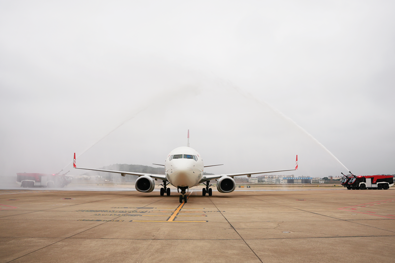 3月31日下午,一架注册编号为B-7377的波音737-800客机平稳降落在福州长乐国际机场,缓缓滑行通过水门仪式,标志着福州航空机队迎来第17架飞机。