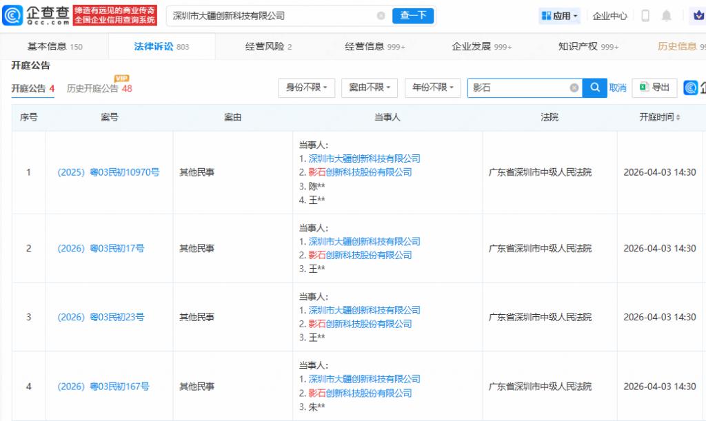 OCR:企查查 缔造有远见的商业传奇 深圳市大疆创新科技有限公司 查一下 应用 企业中心 > 全国企业信用查询系统 S 4 V C.cor 基本信息150 法律诉讼803 经营风险2 经营信息999+ 企业发展999+ 知识产权999+ 历史信息 开庭公告 四 开庭公告4 历史开庭公告48 身份不限 案由不限 年份不限 影石 X Q 取消 导出 序号 案号 案由 当事人 法院 开庭时间 当事人: 1.深圳市大疆创新科技有限公司 (2025)粤03民初10970号 其他民事 2.影石创新科技股份有限公司 广东省深圳市中级人民法院 2026-04-0314:30 3.陈** 4.王** 当事人: 1.深圳市大疆创新科技有限公司 2 (2026)粤03民初17号 其他民事 广东省深圳市中级人民法院 2026-04-0314:30 2.影石创新科技股份有限公司 3.王** 当事人: (2026)粤03民初23号 其他民事 1.深圳市大疆创新科技有限公司 Y 广东省深圳市中级人民法院 2026-04-0314:30 2.影石创新科技股份有限公司 3.王** 当事人: 1.深圳市大疆创新科技有限公司 (2026)粤03民初167号 其他民事 广东省深圳市中级人民法院 2.影石创新科技股份有限公司 2026-04-0314:30 3.朱