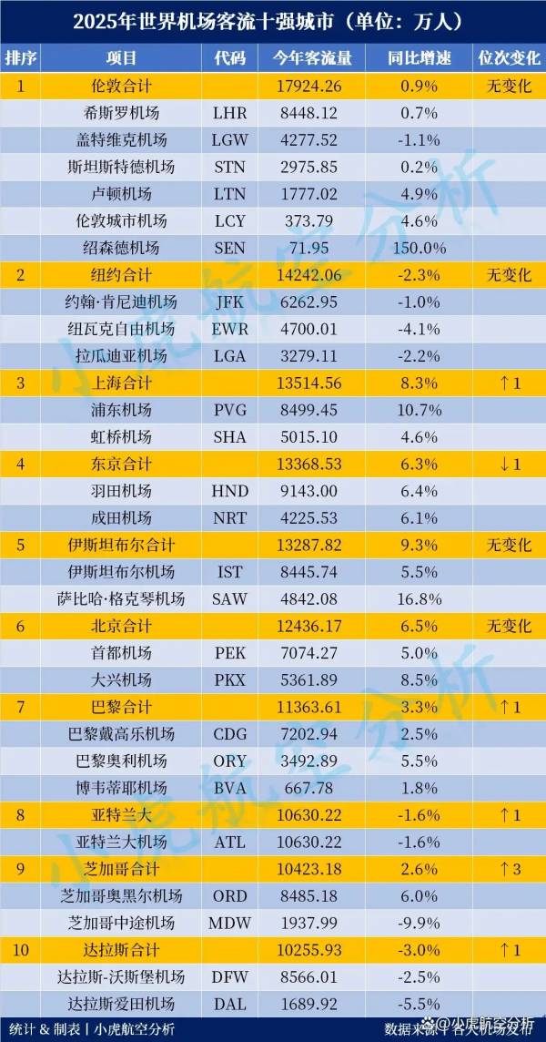 其中,伦敦以1.79亿人次居首,同比增长0.9%,希思罗机场承担了其中47%的客流量。纽约以1.42亿人次位列第二,同比下降2.3%。上海则以1.35亿人次跃居第三,同比增长8.3%,首次进入全球前三,并超越东京成为亚洲最繁忙的机场城市,创下其机场客流排名历史新高。
