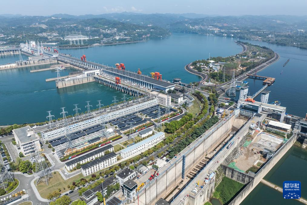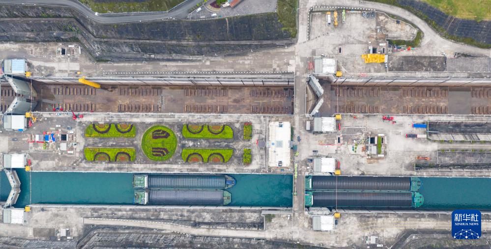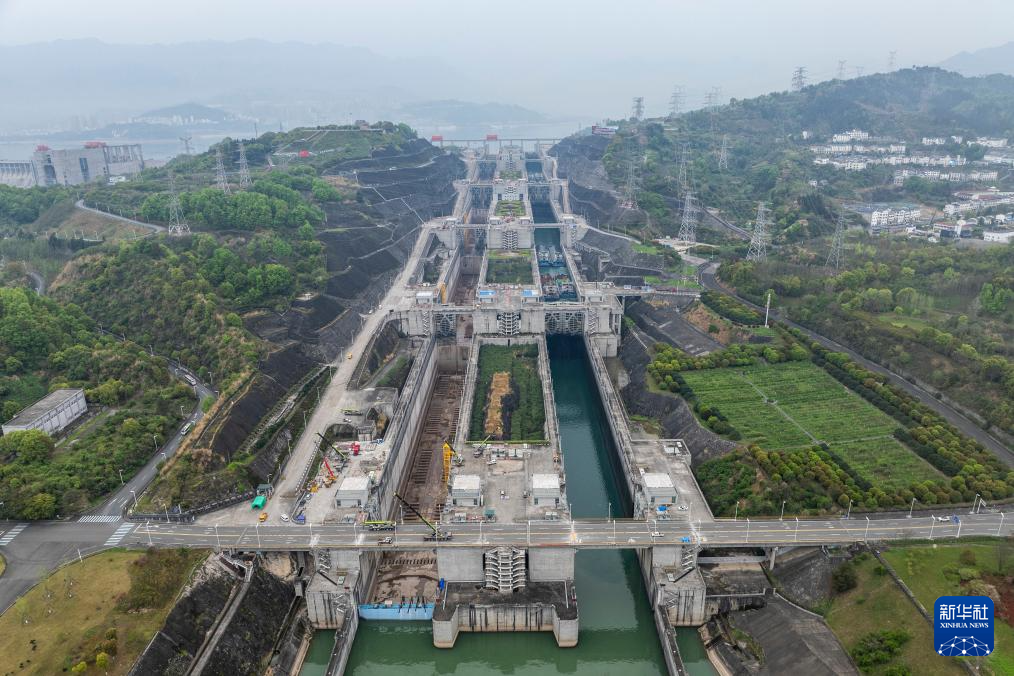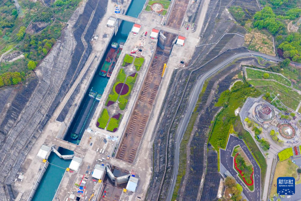 4月2日,三峡枢纽南线船闸加紧检修,北线船闸有序通航(无人机照片)。新华社发(郑家裕摄)