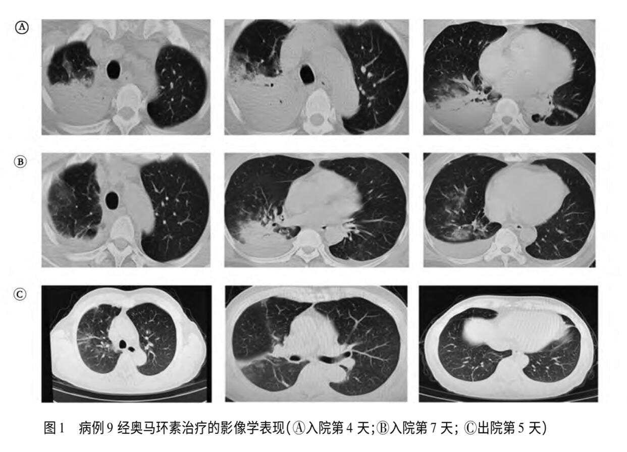 OCR:A B C 图1病例9经奥马环素治疗的影像学表现(A入院第4天;B入院第7天;C出院第5天)