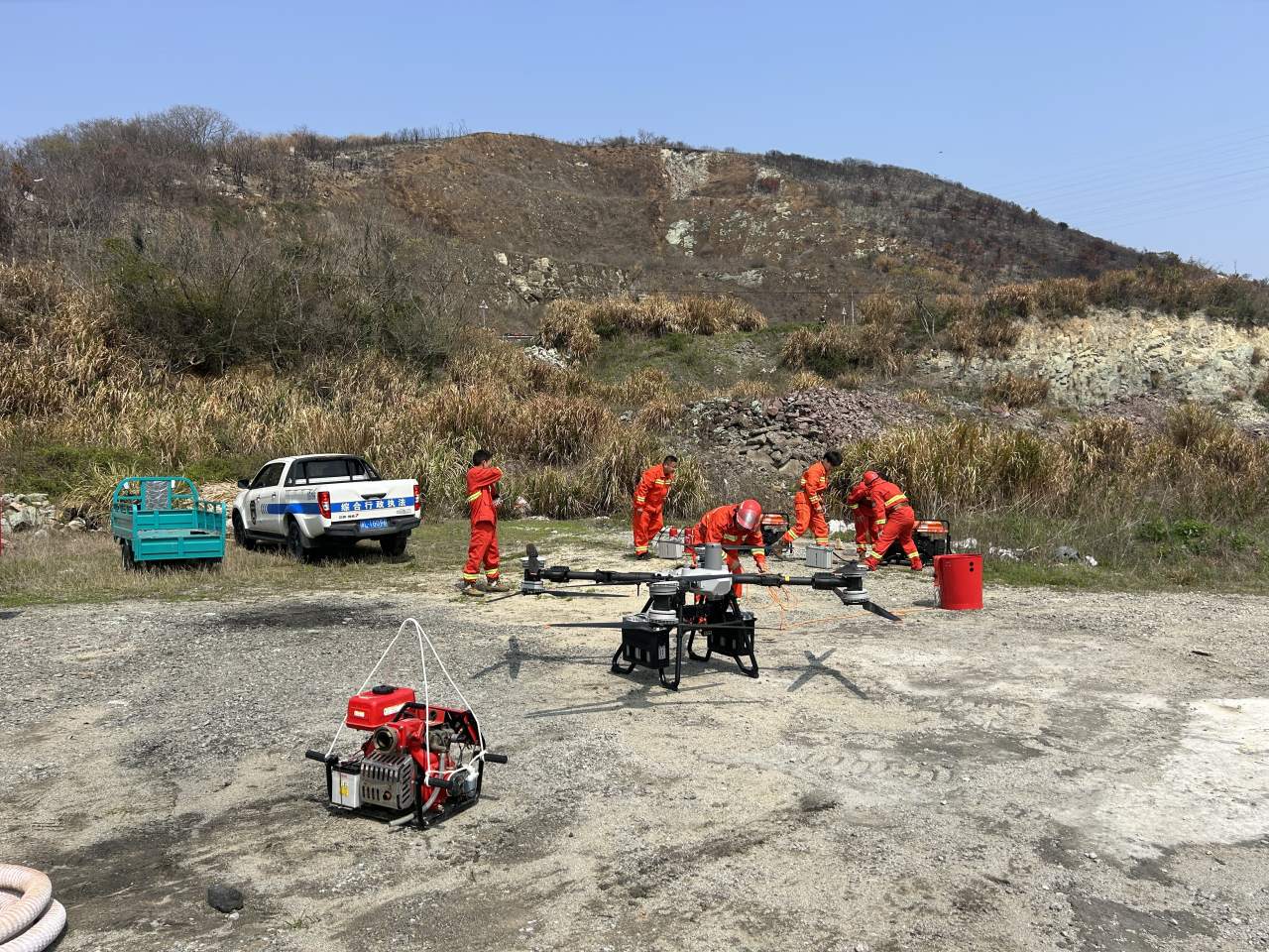 演练模拟长涂镇一山林突发火情,护林员发现后第一时间上报。长涂镇指挥部通过监控锁定起火点,迅速启动应急响应。救援队伍、灭火装备快速集结。演练现场,在专业飞手的操控下,无人机起飞侦察、吊运装备、牵引水带……人机配合,空地协同,快速、有序展开扑救。