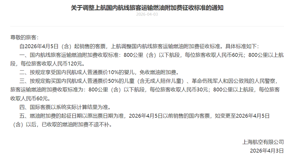 4月3日,东方航空、上海航空相继发布通知,自2026年4月5日(含)起销售的客票,调整国内航线旅客运输燃油附加费征收标准。具体如下: