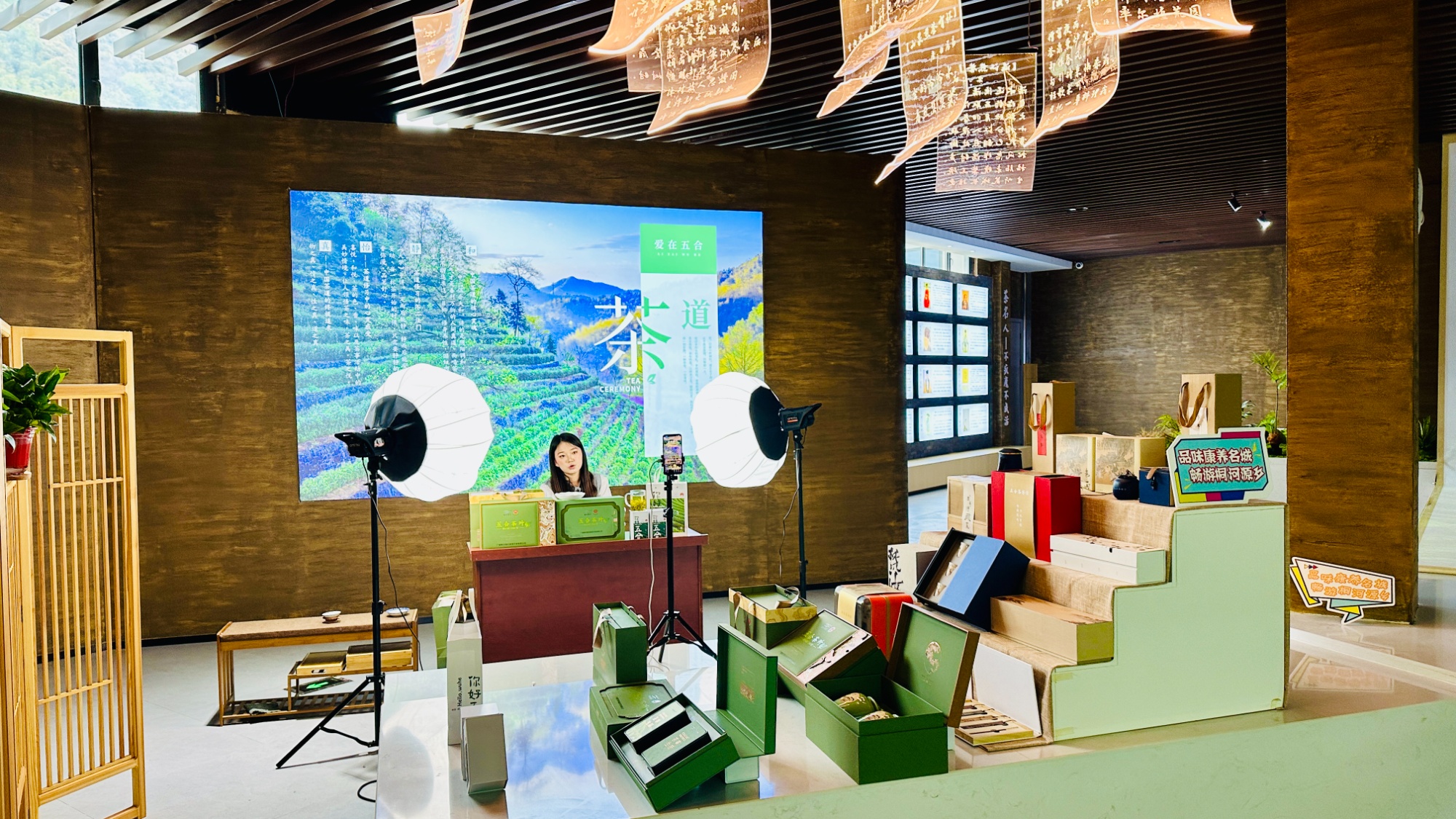 开幕式现场,五合茶山被打造成“天然演播厅”,半坡铺设的“绿了青山,富了茶农”大型立体主题字,在无人机航拍镜头下极具视觉冲击力,成为春日茶山最亮眼的风景。上午9时许,云端号角吹响,抖音直播间同步播放五合茶山云雾航拍宣传片,将山间灵秀与春茶鲜嫩传递给全国网友;随着敲响开山锣,数十名茶农有序步入茶园,指尖翻飞间,一片片嫩绿的茶芽被小心翼翼收入竹篓,脸上洋溢着丰收的喜悦。与此同时,首场直播正式开启,主播在茶园实景中介绍五合茶的品质特点,同步上架首批明前茶及预售雨前口粮茶;领导及企业代表则前往五合茶博馆参观品茶,感受五合茶的文化底蕴与匠心工艺。