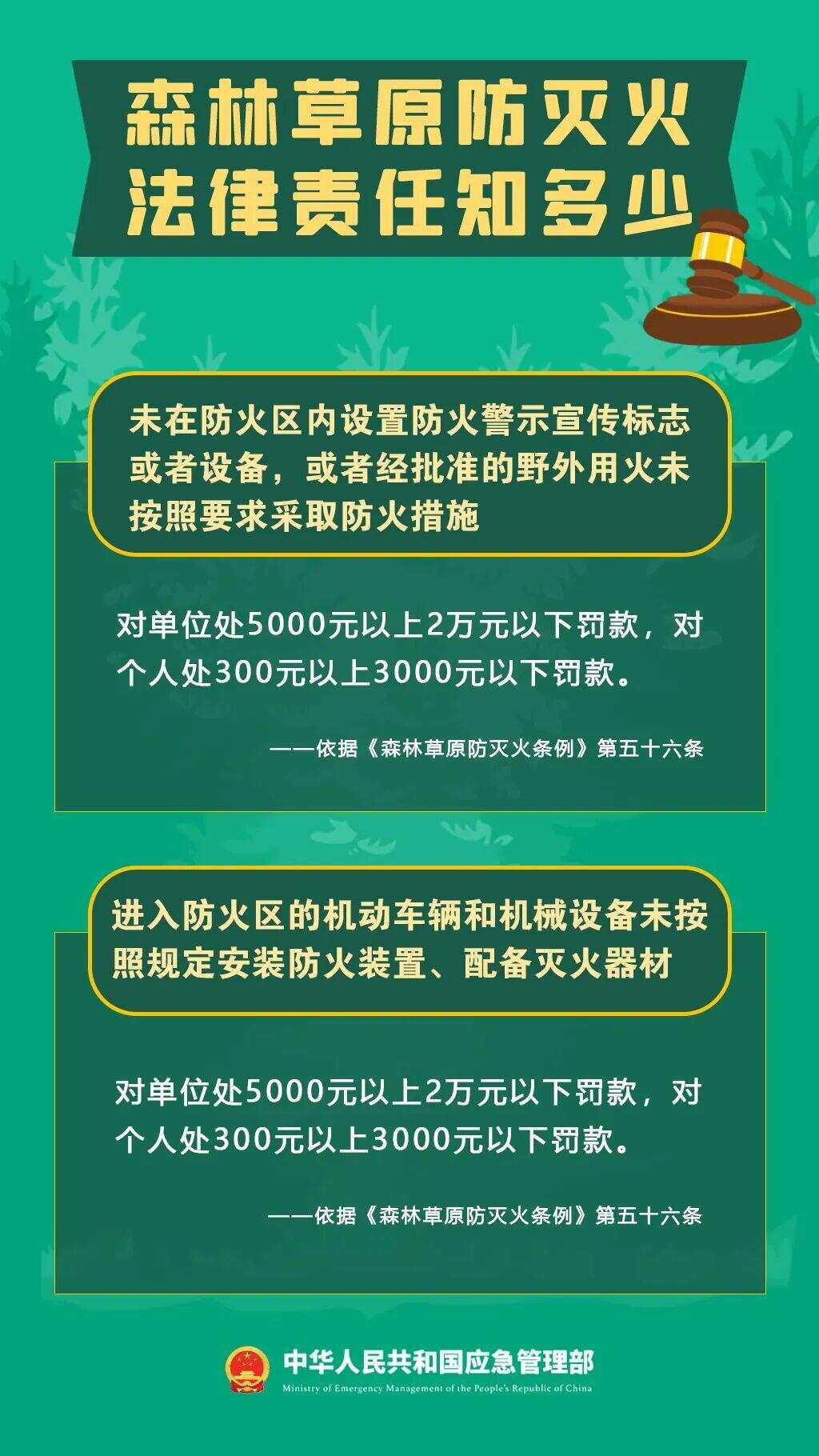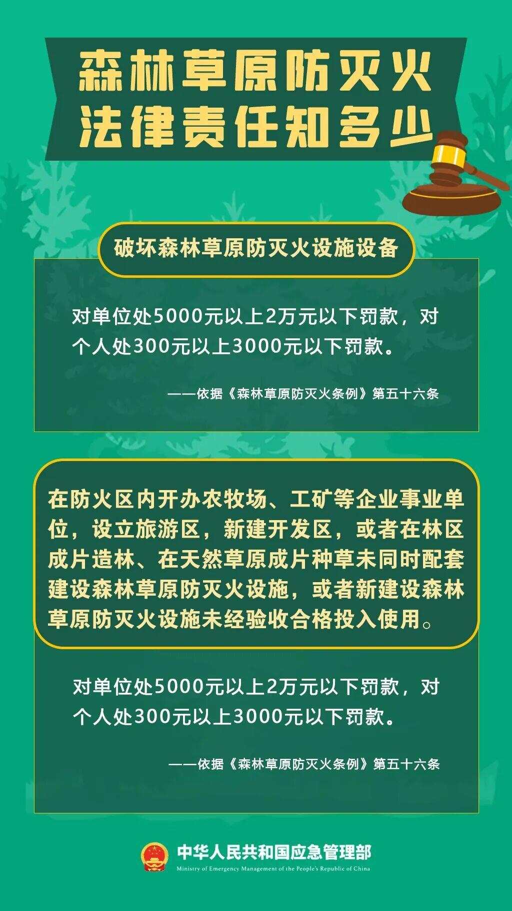 OCR:森林草原防灭火 法律责任知多少 未在防火区内设置防火警示宣传标志 或者设备,或者经批准的野外用火未 按照要求采取防火措施 对单位处5000元以上2万元以下罚款,对 个人处300元以上3000元以下罚款。 一依据《森林草原防灭火条例》第五十六条 进入防火区的机动车辆和机械设备未按 照规定安装防火装置、配备灭火器材 对单位处5000元以上2万元以下罚款,对 个人处300元以上3000元以下罚款。 —一依据《森林草原防灭火条例》第五十六条 中华人民共和国应急管理部 Ministry of Emergency Management of the Peoples Republic of China