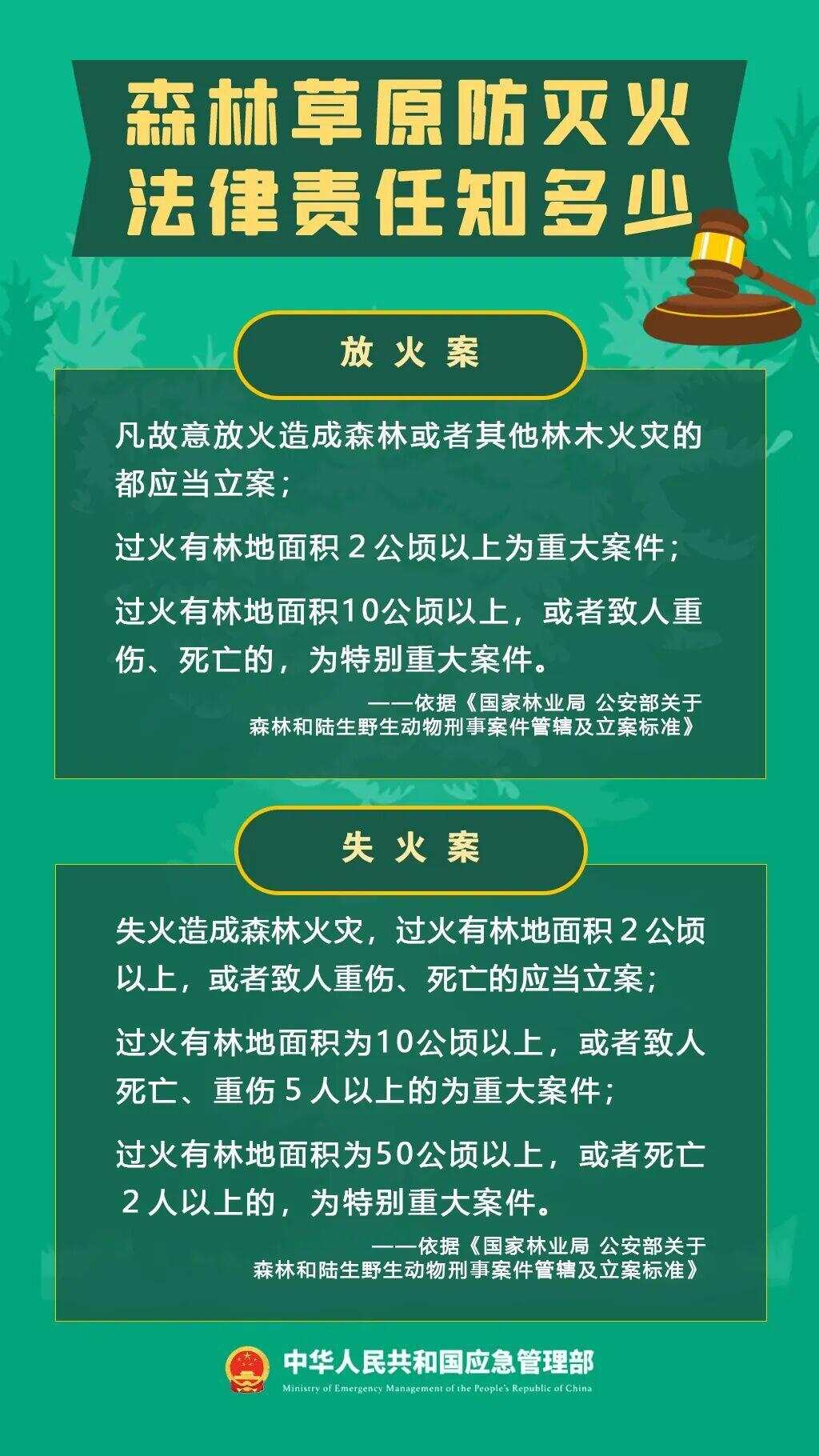 OCR:森林草原防灭火 法律责任知多少 放火案 凡故意放火造成森林或者其他林木火灾的 都应当立案; 过火有林地面积2公顷以上为重大案件 过火有林地面积10公顷以上,或者致人重 伤、死亡的,为特别重大案件。 依据《国家林业局公安部关于 森林和陆生野生动物刑事案件管辖及立案标准》 失火案 失火造成森林火灾,过火有林地面积2公顷 以上,或者致人重伤、死亡的应当立案; 过火有林地面积为10公顷以上,或者致人 死亡、重伤5人以上的为重大案件; 过火有林地面积为50公顷以上,或者死亡 2人以上的,为特别重大案件。 依据《国家林业局公安部关于 森林和陆生野生动物刑事案件管辖及立案标准》 中华人民共和国应急管理部 Ministry of Emergency Mansgemeat of thePeople's Republic of China