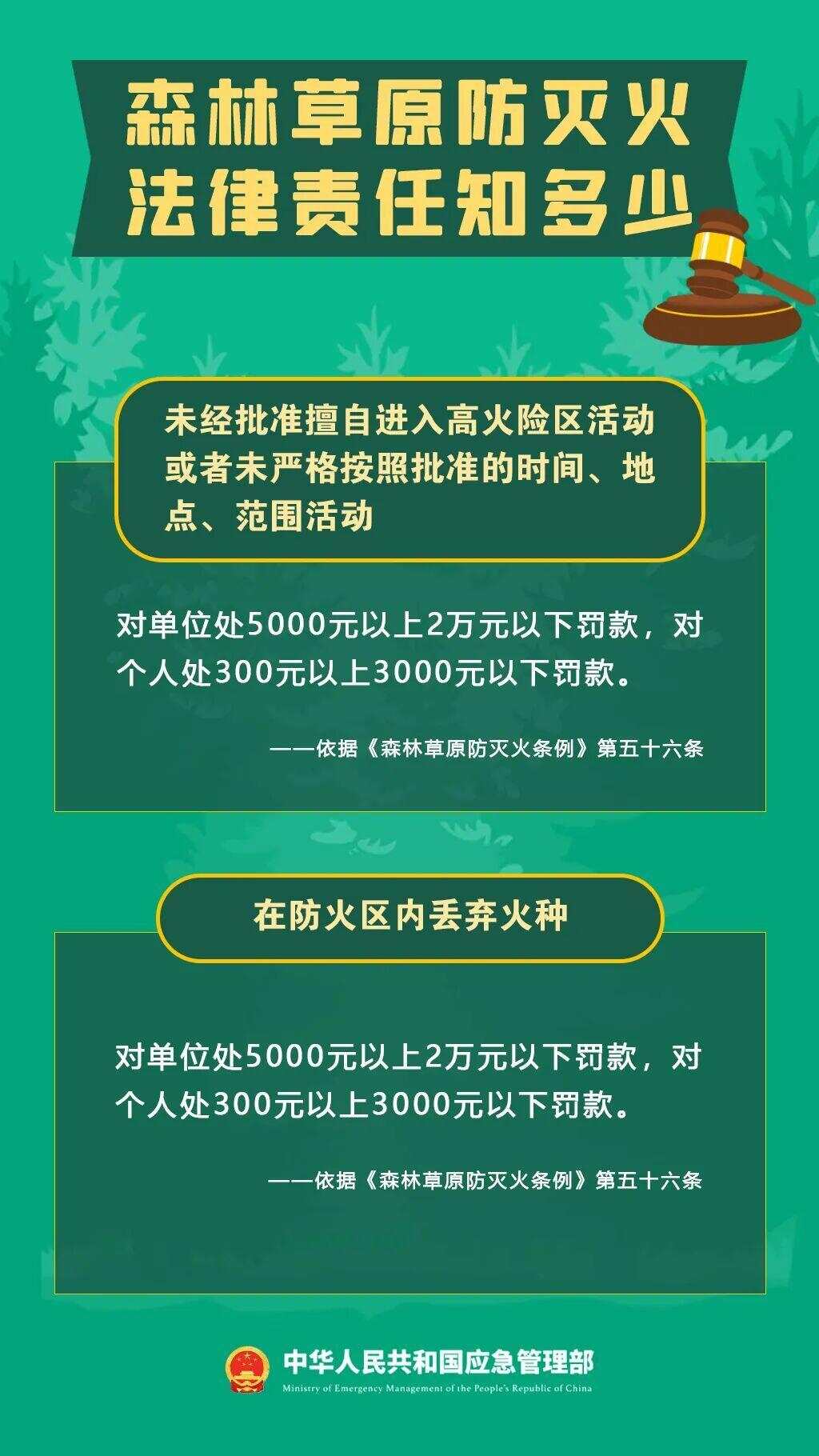 OCR:森林草原防灭火 法律责任知多少 未经批准擅自进入高火险区活动 或者未严格按照批准的时间、地 点、范围活动 对单位处5000元以上2万元以下罚款,对 个人处300元以上3000元以下罚款。 一依据《森林草原防灭火条例》第五十六条 在防火区内丢弃火种 对单位处5000元以上2万元以下罚款,对 个人处300元以上3000元以下罚款。 一依据《森林草原防灭火条例》第五十六条 中华人民共和国应急管理部 Ministry of Emergency Managementofihe People Republic of China