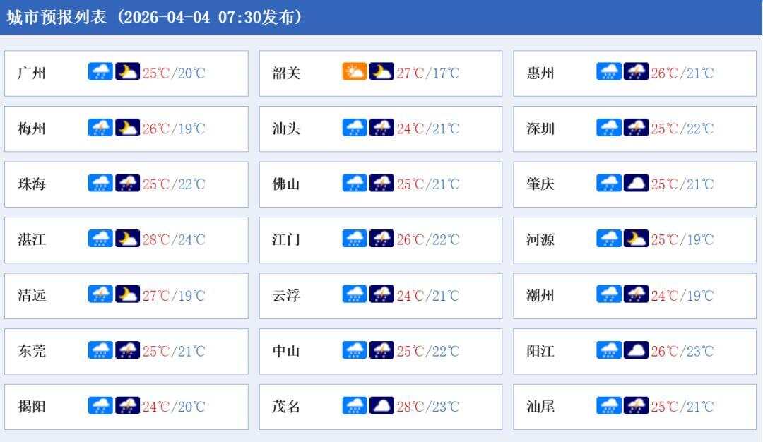 4月4日(清明假期首日),受弱冷空气南下影响,切变线进一步南压,雨带向南移动,广东中部和南部市县有中到大雨局部暴雨,雷雨时伴有8~10级(局地11级)短时大风、短时强降水和局地小冰雹等强对流天气。