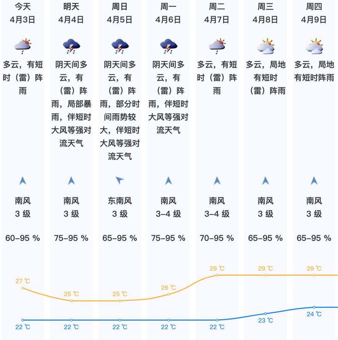 3日多云,有短时雷阵雨,气温22-27℃;