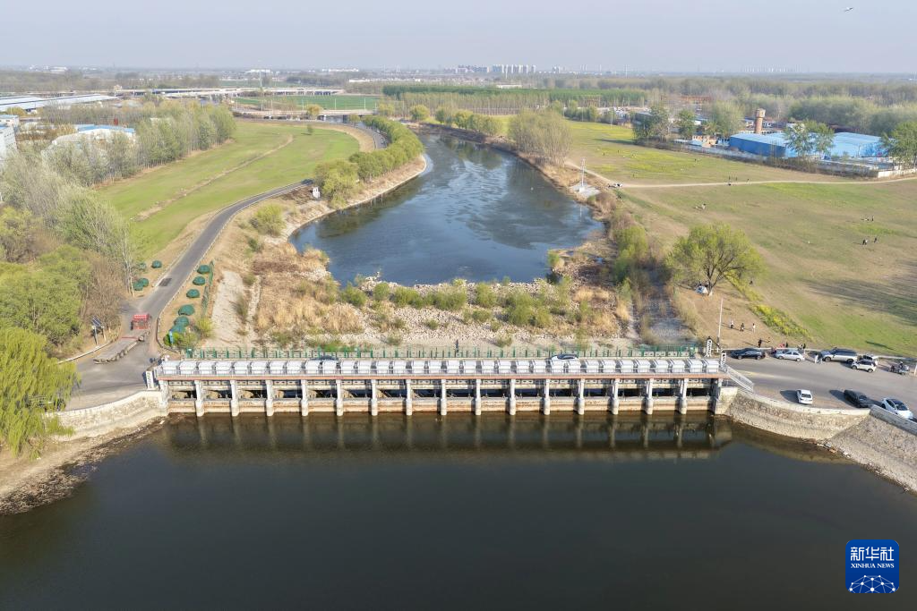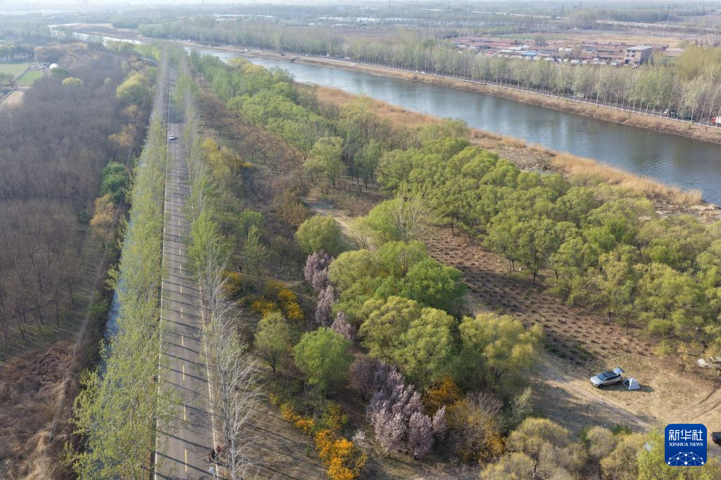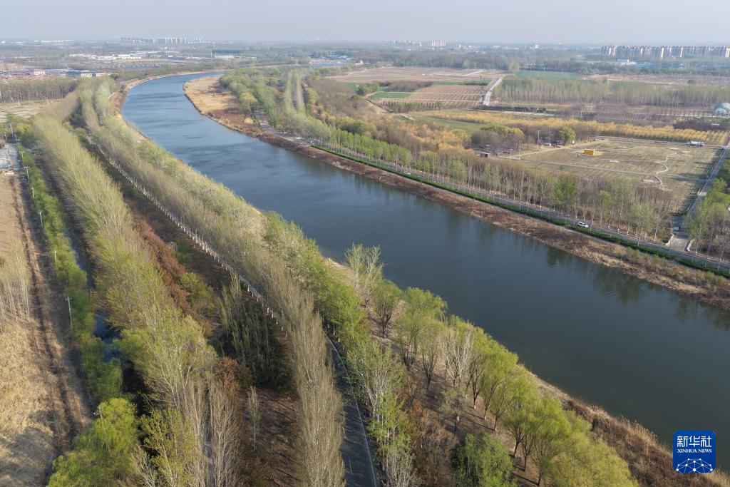 4月4日拍摄的京杭大运河天津武清段的春天景色(无人机照片)。