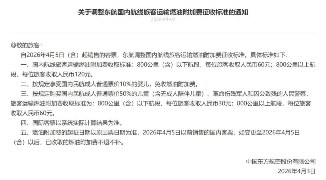 OCR:关于调整东航国内航线旅客运输燃油附加费征收标准的通知 2026-04-03 尊敬的旅客: 自2026年4月5日(含)起销售的客票,东航调整国内航线旅客运输燃油附加费征收标准。具体标准如下: 一、国内航线旅客运输燃油附加费收取标准:800公里(含)以下航段,每位旅客收取人民币60元;800公里以上航 段,每位旅客收取人民币120元。 二、按规定享受国内民航成人普通票价10%的婴儿,免收燃油附加费 三、按规定购买国内民航成人普通票价50%的儿童(含无成人陪伴儿童)、革命伤残军人和因公致残的人民警察 旅客运输燃油附加费收取标准为:800公里(含)以下航段,每位旅客收取人民币30元:800公里以上航段,每位旅客 收取人民币60元。 四、国际客票以系统实际计算结果为准 五、燃油附加费的起征日期以原出票日期为准,2026年4月5日以前销售的国内客票,如变更至2026年4月5日 (含)以后,已收取的燃油附加费不退不补 中国东方航空股份有限公司 2026年4月3日