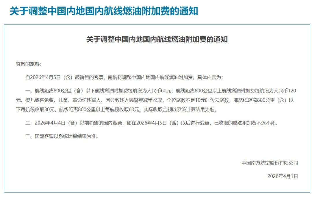 OCR:关于调整中国内地国内航线燃油附加费的通知 关于调整中国内地国内航线燃油附加费的通知 尊敬的旅客: 自2026年4月5日(含)起销售的客票,南航将调整中国内地国内航线燃油附加费。具体内容为: 一、航线距离800公里(含)以下航线燃油附加费每航段为人民币60元;航线距离800公里以上航线燃油附加费每航段为人民币120 元。婴儿旅客免收。儿童、革命伤残军人、因公致残人民警察减半收取,个位尾数不足10元时舍去尾数,即航线距离800公里(含)以 下每航段收取30元,航线距离800公里以上每航段收取60元。实际收取金额以系统计算结果为准。 二、2026年4月4日(含)以前销售的国内客票,如在2026年4月5日(含)以后进行变更,已收取的燃油附加费不退不补。 三、国际客票以系统计算结果为准。 中国南方航空股份有限公司 2026年4月1日