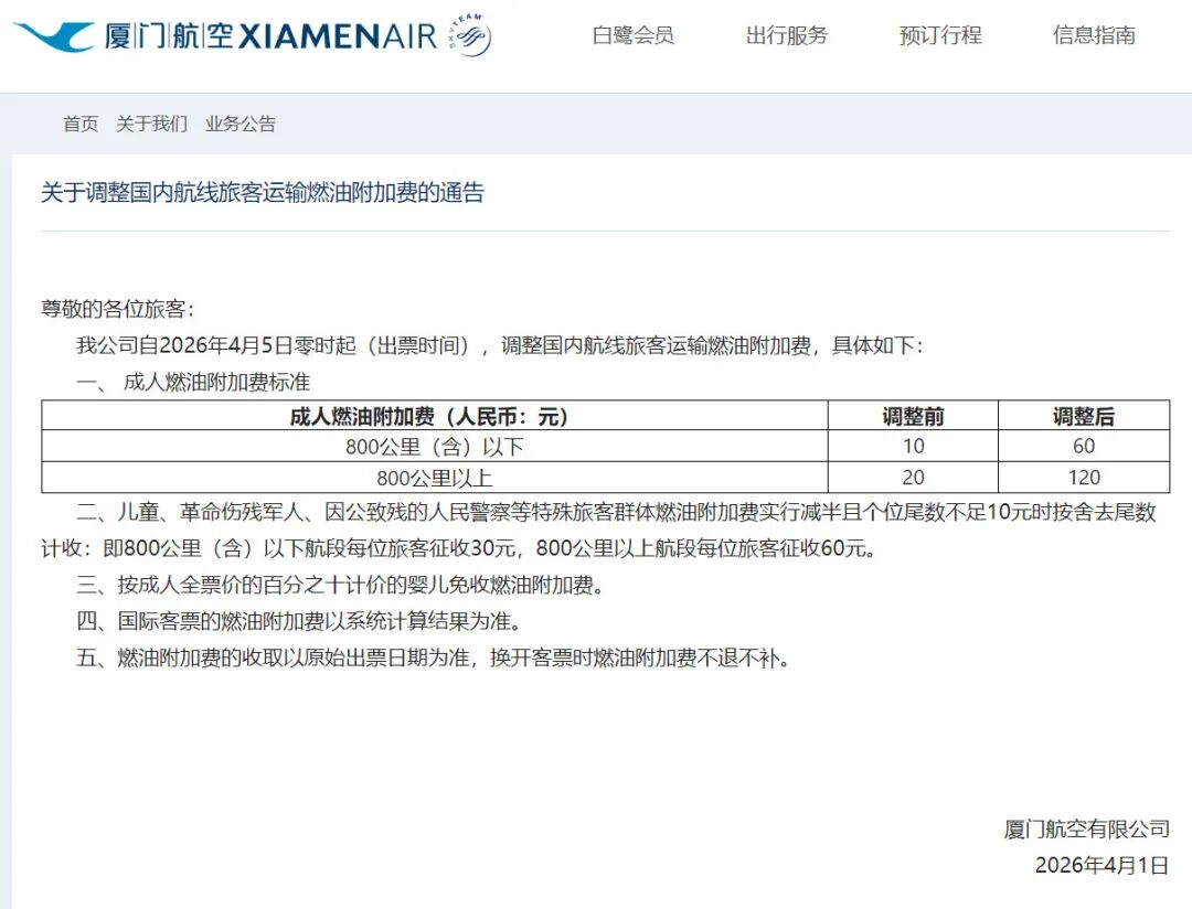 OCR:厦门航I空XIAMENAIR 白鹭会员 出行服务 预订行程 信息指南 首页关于我们业务公告 关于调整国内航线旅客运输燃油附加费的通告 尊敬的各位旅客: 我公司自2026年4月5日零时起(出票时间),调整国内航线旅客运输燃油附加费,具体如下: 一、成人燃油附加费标准 成人燃油附加费(人民币:元) 调整前 调整后 800公里(含)以下 10 60 800公里以上 20 120 二、儿童、革命伤残军人、因公致残的人民警察等特殊旅客群体燃油附加费实行减半且个位尾数不足10元时按舍去尾数 计收:即800公里(含)以下航段每位旅客征收30元,800公里以上航段每位旅客征收60元。 三、按成人全票价的百分之十计价的婴儿免收燃油附加费。 四、国际客票的燃油附加费以系统计算结果为准。 五、燃油附加费的收取以原始出票日期为准,换开客票时燃油附加费不退不补 厦门航空有限公司 2026年4月1日