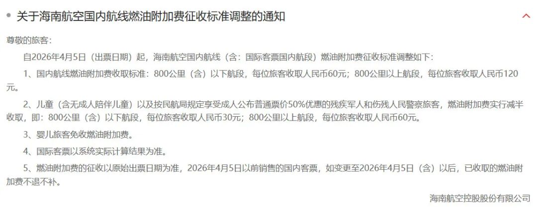 OCR:·关于海南航空国内航线燃油附加费征收标准调整的通知 尊敬的旅客: 自2026年4月5日(出票日期)起,海南航空国内航线(含:国际客票国内航段)燃油附加费征收标准调整如下: 1、国内航线燃油附加费收取标准:800公里(含)以下航段,每位旅客收取人民币60元;800公里以上航段,每位旅客收取人民币120 元。 2、儿童(含无成人陪伴儿童)以及按民航局规定享受成人公布普通票价50%优惠的残疾军人和伤残人民警察旅客,燃油附加费实行减半 收取,即:800公里(含)以下航段,每位旅客收取人民币30元;800公里以上航段,每位旅客收取人民币60元 3、婴儿旅客免收燃油附加费 4、国际客票以系统实际计算结果为准。 5、燃油附加费的征收以原始出票日期为准,2026年4月5日以前销售的国内客票,如变更至2026年4月5日(含)以后,已收取的燃油附 加费不退不补。 海南航空控股股份有限公司