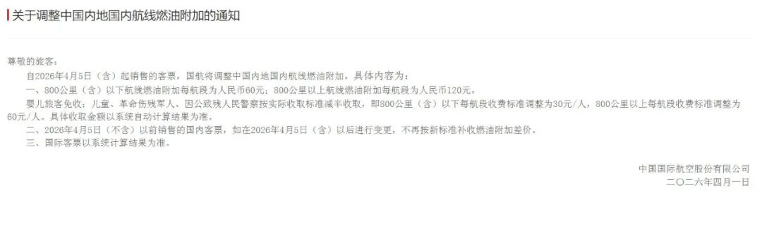OCR:1关于调整中国内地国内航线燃油附加的通知 尊敬的旅客: 自2026年4月5日(含)起销售的客票,国航将调整中国内地国内航线燃油附加。具体内容为: 、800公里(含)以下航线燃油附加每航段为人民币60元:800公里以上航线燃油附加每航段为人民币120元 婴儿旅客免收;儿童、革命伤残军人、因公致残人民警察按实际收取标准减半收取,即800公里(含)以下每航段收费标准调整为30元/人,800公里以上每航段收费标准调整为 60元/人。具体收取金额以系统自动计算结果为准, 二、2026年4月5日(不含)以前销售的田内客票,如在2026年4月5日(含)以后进行变更,不再按新标准补收燃油附加差价。 三、国际客票以系统计算结果为准。 中国国际航空股份有限公司 二〇二六年四月一日