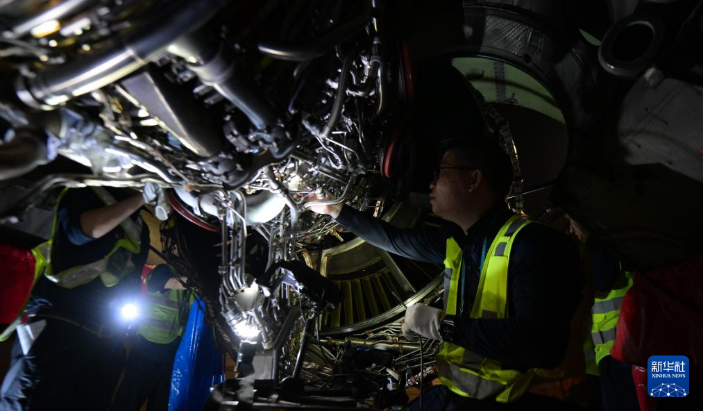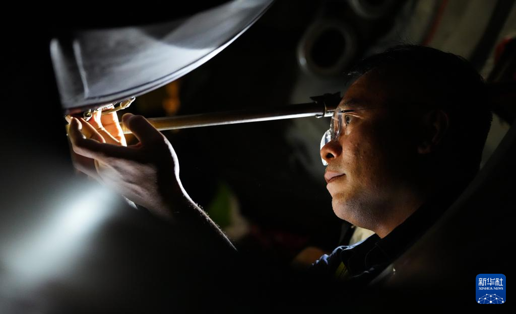 在海口美兰国际机场停机坪上,南航工程技术分公司机务工程师对“消博号”彩绘飞机进行深度检查(4月4日摄)。