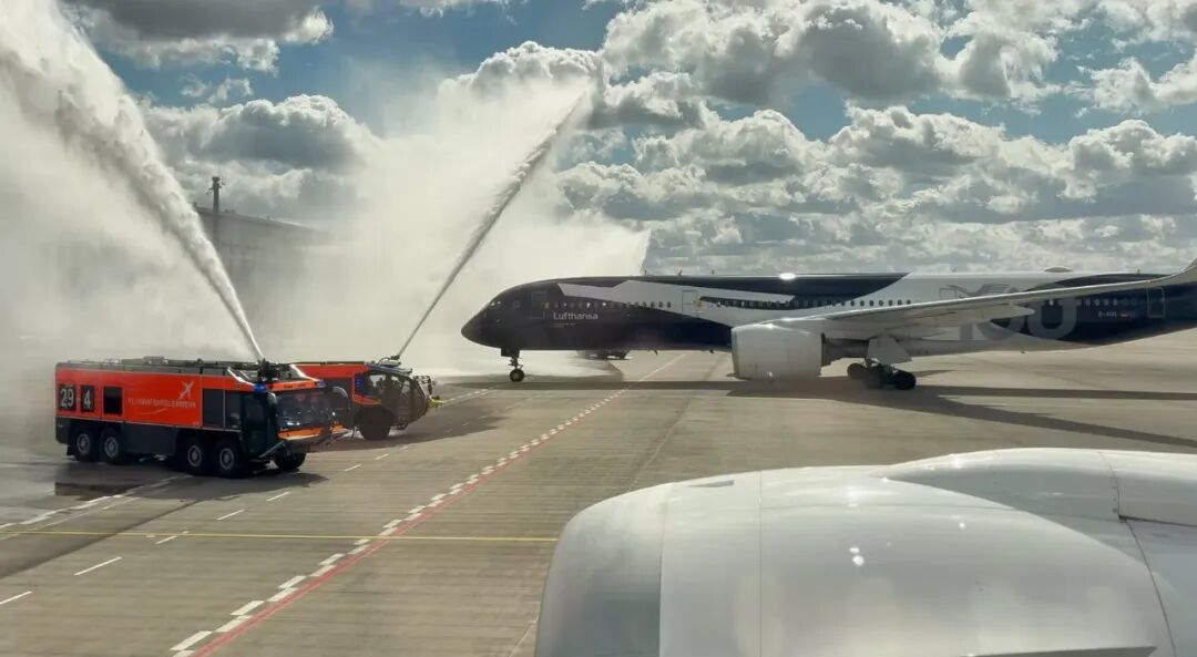 rnt作为柏林勃兰登堡机场纪念活动的一部分,两架经过特别装饰的汉莎航空客机抵达现场,接受了机场消防队联合进行的水门礼,随后起飞执行复刻历史航线的纪念飞行。rn