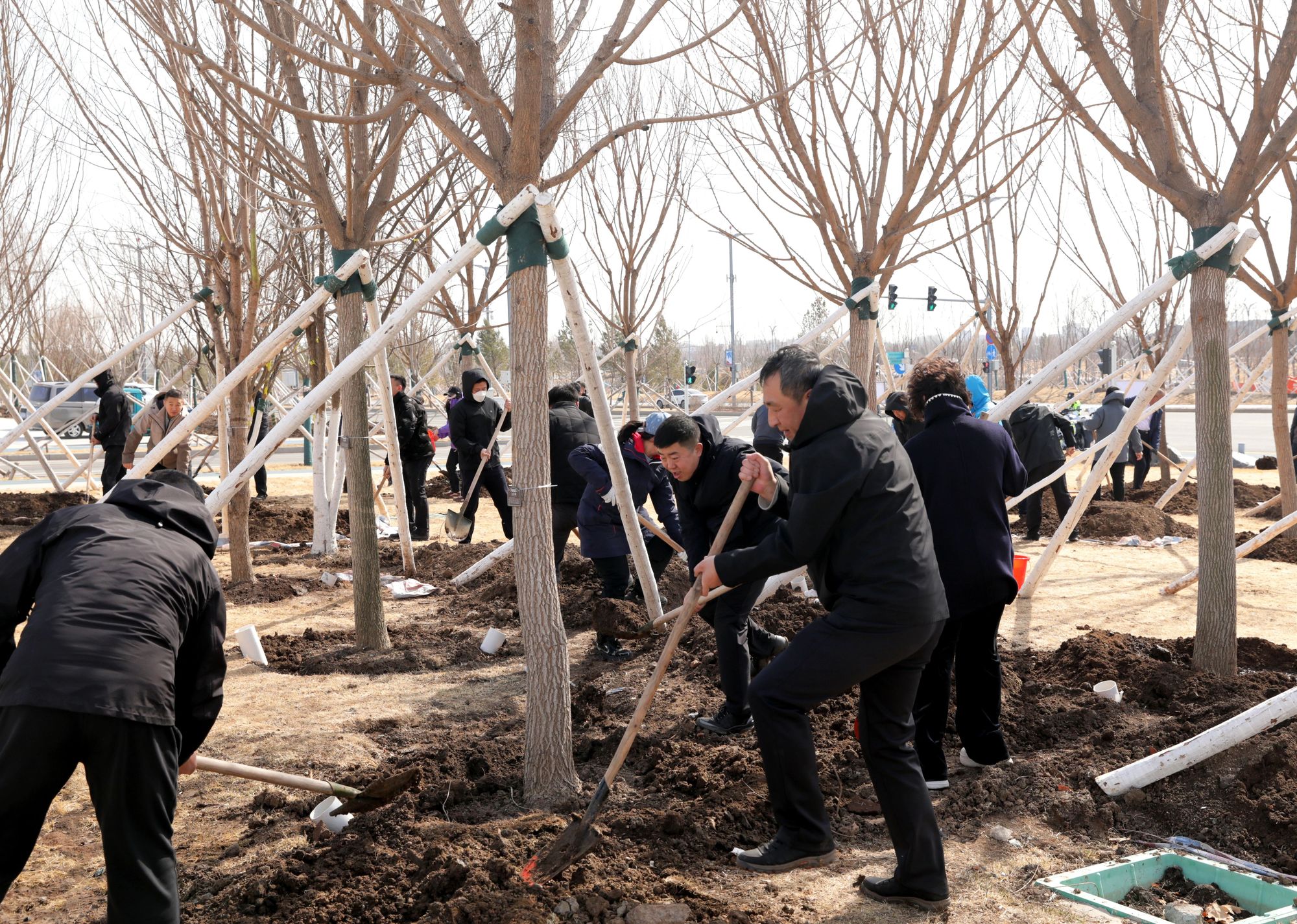 活动现场处处洋溢着热火朝天的劳动景象。区领导与机关党员干部三五人一组、分工协作,挥锹铲土、扶苗定植、培土围堰、提水浇灌,每一个环节都认真细致、一丝不苟,用双手栽种下圆柏、山槐、五角枫等树苗,也种下了守护绿色生态、助力航博发展的美好心愿。大家一边劳动、交流植树技巧,一边分享生态保护心得,探讨航博城未来发展,在协同劳作中凝聚合力。