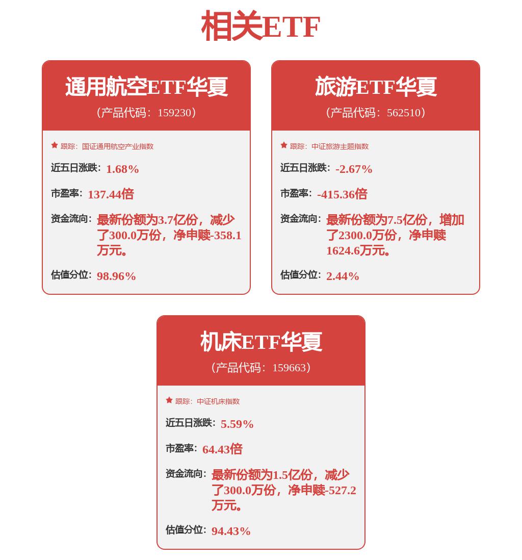 OCR:相关ETF 通用航空ETF华夏 旅游ETF华夏 (产品代码:159230) (产品代码:562510) 跟踪:国证通用航空产业指数 ★跟踪:中证旅游主题指数 近五日涨跌:1.68% 近五日涨跌:-2.67% 市盈率:137.44倍 市盈率:-415.36倍 资金流向: 最新份额为3.7亿份,减少 资金流向: 最新份额为7.5亿份,增加 了300.0万份,净申赎-358.1 了2300.0万份,净申赎 万元。 1624.6万元。 估值分位:98.96% 估值分位:2.44% 机床ETF华夏 (产品代码:159663) ★跟踪:中证机床指数 近五日涨跌:5.59% 市盈率:64.43倍 资金流向: 最新份额为1.5亿份,减少 了300.0万份,净申赎-527.2 万元。 估值分位:94.43%