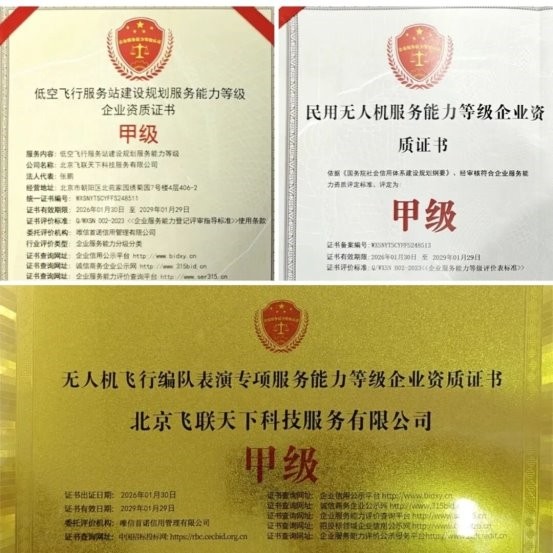 这是继今年1月,天九通航先后取得低空飞行服务站建设规划服务能力甲级资质、民用无人机服务能力等级甲级资质、无人机飞行编队表演专项服务能力甲级资质后,再次获得权威认证。短短数月多项资质加持,充分印证天九通航在低空经济领域的运营能力。
