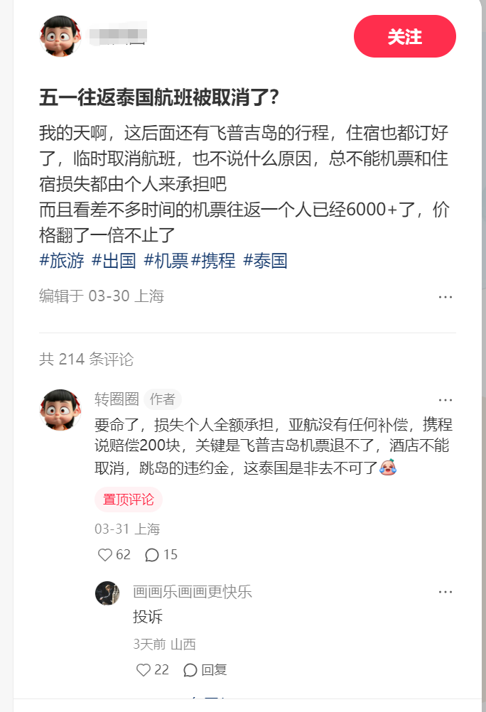 OCR:关注 五一往返泰国航班被取消了? 我的天啊,这后面还有飞普吉岛的行程,住宿也都订好 了,临时取消航班,也不说什么原因,总不能机票和住 宿损失都由个人来承担吧 而且看差不多时间的机票往返一个人已经6000+了,价 格翻了一倍不止了 #旅游#出国#机票#携程#泰国 编辑于03-30上海 共214条评论 转圈圈作者 要命了,损失个人全额承担,亚航没有任何补偿,携程 说赔偿200块,关键是飞普吉岛机票退不了,酒店不能 取消,跳岛的违约金,这泰国是非去不可了 置顶评论 03-31上海 62 O15 画画乐画画更快乐 投诉 3天前山西 22回复