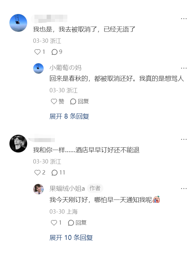 OCR:我也是,我去被取消了,已经无语了 03-30浙江 Q1 D9 小葡萄の妈 回来是春秋的,都被取消还好。我真的是想骂人 03-30浙江 赞 回复 展开8条回复 我和你一样...酒店早早订好还不能退 03-30浙江 2 O11 果蝠绒小姐a作者 我今天刚订好,哪怕早一天通知我呢 03-30上海 1 回复 展开10条回复