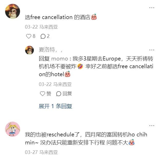 OCR:选freecancellation的酒店 03-22马来西亚 8 D2 夏洛特,, 回复momo:我多3星期去Europe,天天祈祷转 机机场不要被炸幸好之前都选freecancellati on的hotel 03-22马来西亚 赞 回复 展开1条回复 我的也被reschedule了,四月尾的富国转机hochih min~没办法只能重新安排下行程问题不大 03-27马来西亚