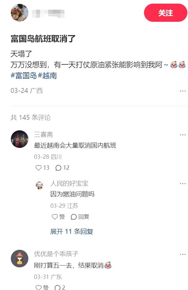 OCR:关注 富国岛航班取消了 天塌了 万万没想到,有一天打仗原油紧张能影响到我阿~ 生 #富国岛#越南 03-24广西 共145条评论 三喜斋 最近越南会大量取消国内航班 03-28四川 1312 人民的好宝宝 因为燃油问题吗 03-29江苏 赞 回复 展开11条回复 优优是个乖孩子 刚打算五一去,结果取消 03-31广东 ?赞 O2
