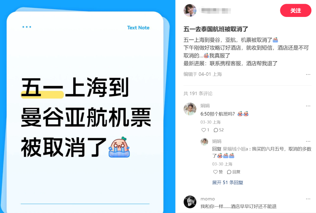 OCR:关注 TextNote 五一去泰国航班被取消了 五一上海到曼谷,亚航,机票被取消了 下午刚做好攻略订好酒店,就收到短信,酒店还是不可 取消的...我真服了 最新进展:联系携程客服,酒店帮我退了 编辑于04-01上海 五一上海到 共191条评论 娟娟 曼谷亚航机票 6:50那个航班吗? 03-30上海 152 被取消了 ono 娟娟 回复果蝠绒小姐a:我买的六月五号,取消的多数 了色色 03-30上海 赞回复 展开51条回复 momo 我和你一样..酒店早早订好还不能退