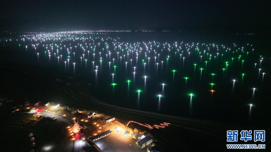 这是2025年10月17日拍摄于青海省海南藏族自治州共和县的恰恰湾沙滩旅游度假村的高原“渔光曲”。(无人机照片)(新华社记者 齐芷玥 摄)