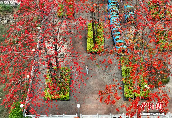 4月15日,福州闽江公园内木棉花竞相绽放。连日来,福州公园、街道种植的木棉树相继迎来盛花期,为城市增添了一抹绚丽色彩。(无人机照片)中新社记者 吕明 摄