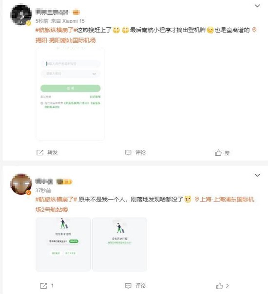 OCR: 5秒前来自Xia0mi15 航旅纵横崩了#这热搜赶上了最后南航小程序才搞出登机牌也是蛮离谱的 揭阳:揭阳潮汕国际机场 产名年生 O 8ITR (%A9A/U) C生S CR* R红6.a5 转发 评论 费 37秒前 #航旅纵横崩了原来不是我一个人,刚落地发现啥都没了上海上海浦东国际机 场2号航站楼 大 次水永行指 活究行E 1 评论 2