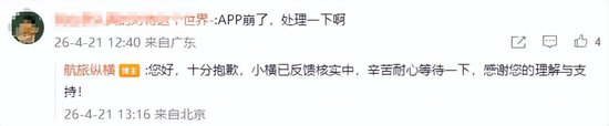 对此,航旅纵横官博在评论区回应称,“十分抱歉,小横已反馈核实中,辛苦耐心等待一下,感谢您的理解与支持!” ;