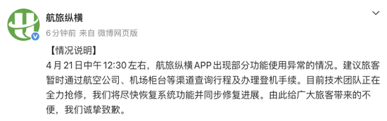 4月21日下午,@航旅纵横 发布情况说明:4月21日中午12:30左右,航旅纵横APP出现部分功能使用异常的情况。建议旅客暂时通过航空公司、机场柜台等渠道查询行程及办理登机手续。目前技术团队正在全力抢修,我们将尽快恢复系统功能并同步修复进展。由此给广大旅客带来的不便,我们诚挚致歉。