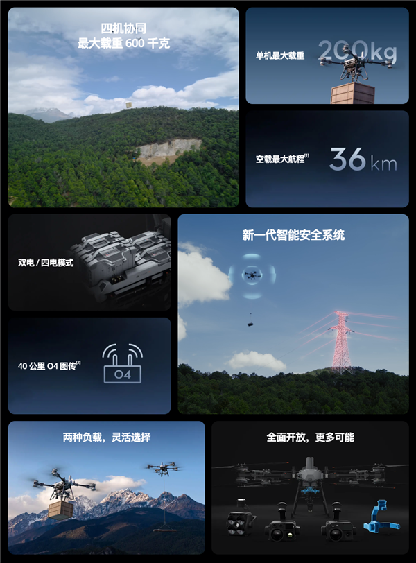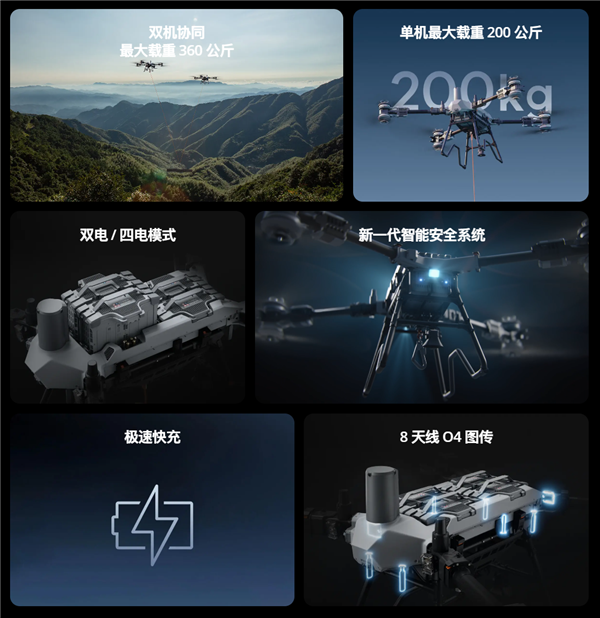 FC200作为新一代重载旗舰,运力实现跨越式突破,单机最大载重200kg,2机协同可达360kg,4机智能联吊最高载重600kg,满足大件物资运输需求。