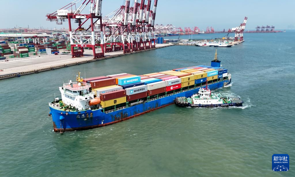 4月24日,“山港龙口”轮靠泊在山东港口青岛港前湾港区。