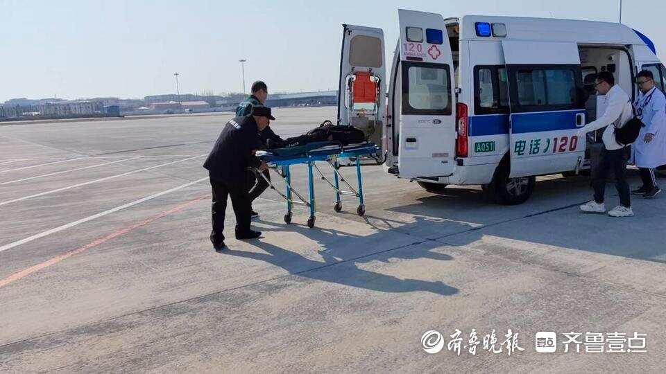 7时56分,救助直升机“B-7313”降落威海机场,机组迅速将患者转交120救护车,为其后续治疗赢得宝贵时间。