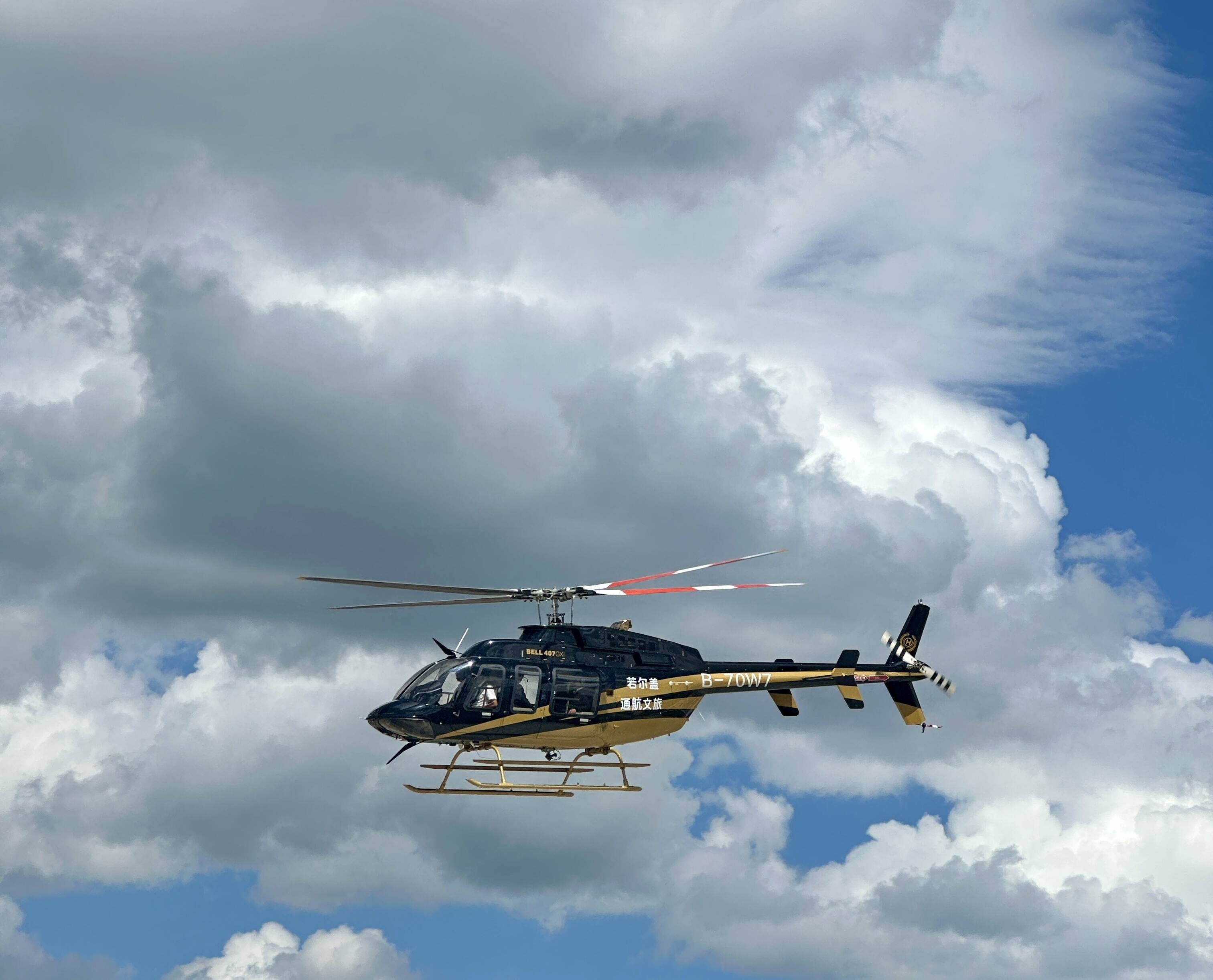 6月26日下午,位于四川阿坝州若尔盖县的低空旅游项目正式启动试运行。两架贝尔407GXi高原直升机带领游客从空中饱览若尔盖草原与黄河九曲的壮美风光,标志着全国首个高高原低空载客航线正式启航,高高原机场是指海拔高度为2438米及以上的机场。