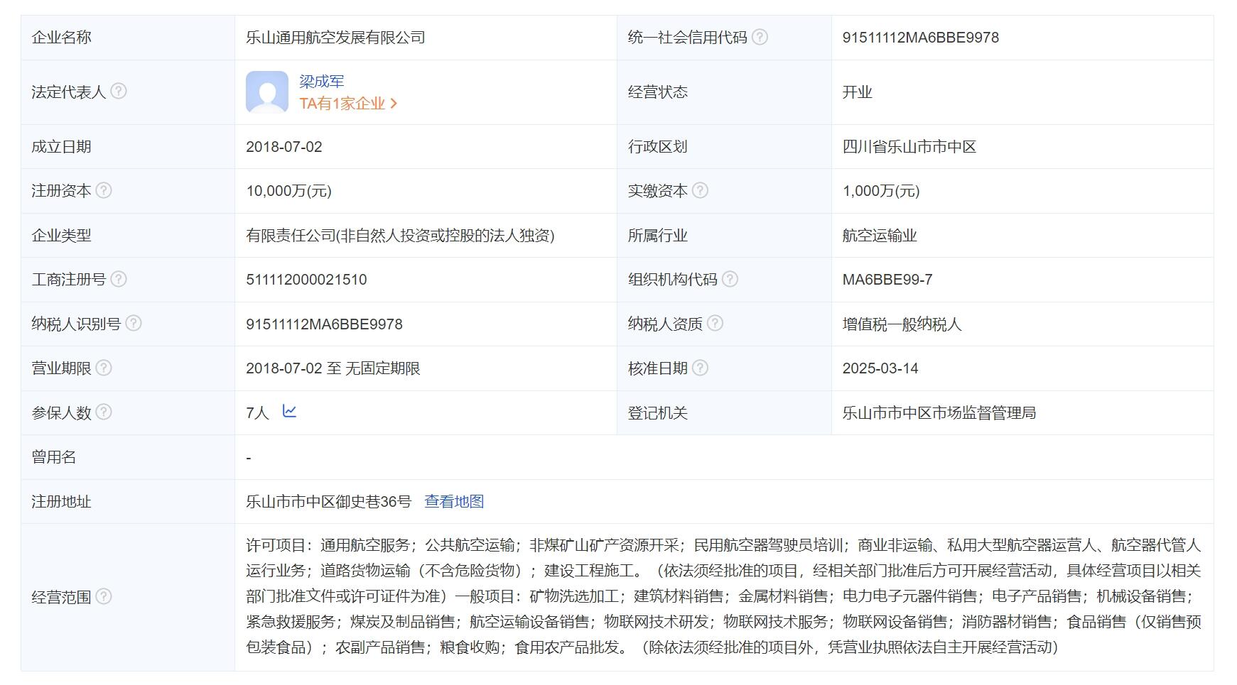 公开资料显示,乐山通用航空发展有限公司成立于2018年7月2日,是乐山国有资产投资运营集团成员,由乐山机场投资发展(集团)有限公司全资控股。公司位于四川省乐山市市中区御史巷36号,主要从事通用航空服务、公共航空运输、非煤矿山矿产资源开采、民用航空器驾驶员培训等业务。截至2025年4月,公司注册资本为1亿元人民币,实缴资本1000万元人民币,属于国有小微企业。2025年3月,法定代表人变更为梁成军。