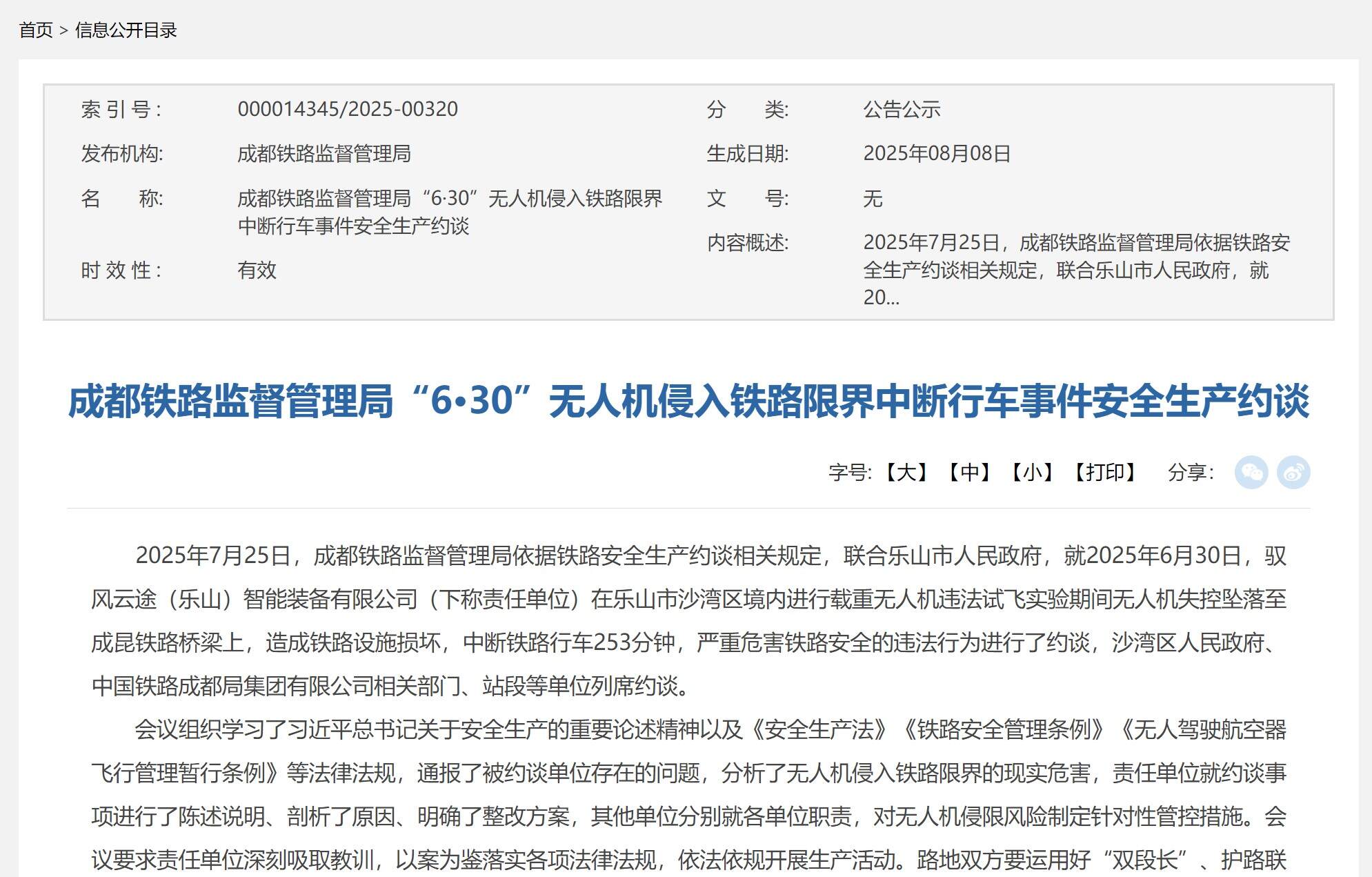 国家铁路局官网信息显示,今年7月25日,成都铁路监督管理局依据铁路安全生产约谈相关规定,联合乐山市人民政府,就今年6月30日驭风云途(乐山)智能装备有限公司在乐山市沙湾区境内进行载重无人机违法试飞实验期间,无人机失控坠落至成昆铁路桥梁上,造成铁路设施损坏,中断铁路行车253分钟,严重危害铁路安全的违法行为进行了约谈,沙湾区人民政府、中国铁路成都局集团有限公司相关部门、站段等单位列席约谈。
