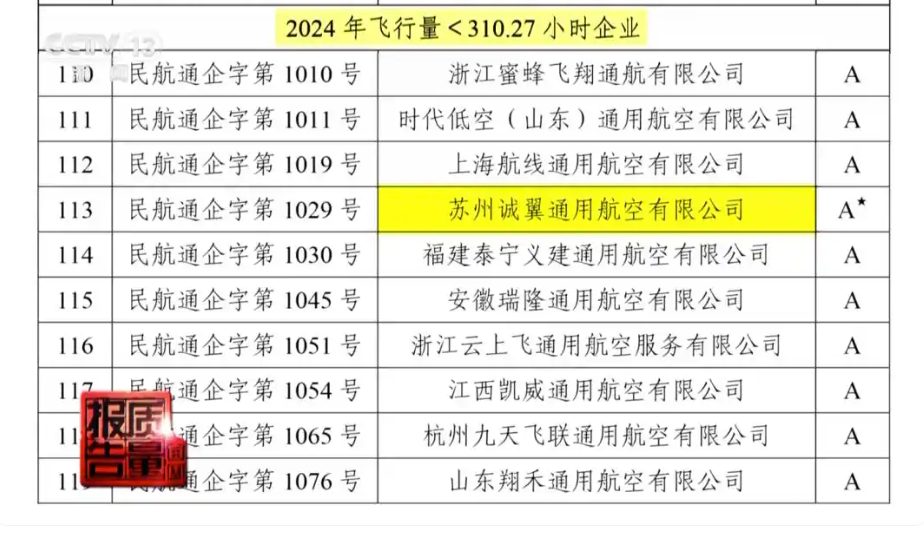 记者在中国民航局官网搜索发现,今年6月10日公布的2024年通用航空企业诚信经营初评结果公示里,“苏州诚翼通用航空有限公司”在2024年开展经营性作业飞行小于310小时,评价结果为A级。同时标注有黑色五角星,表示这家公司在今年经营评价发布日前,发生过通航事故,导致人员死亡。