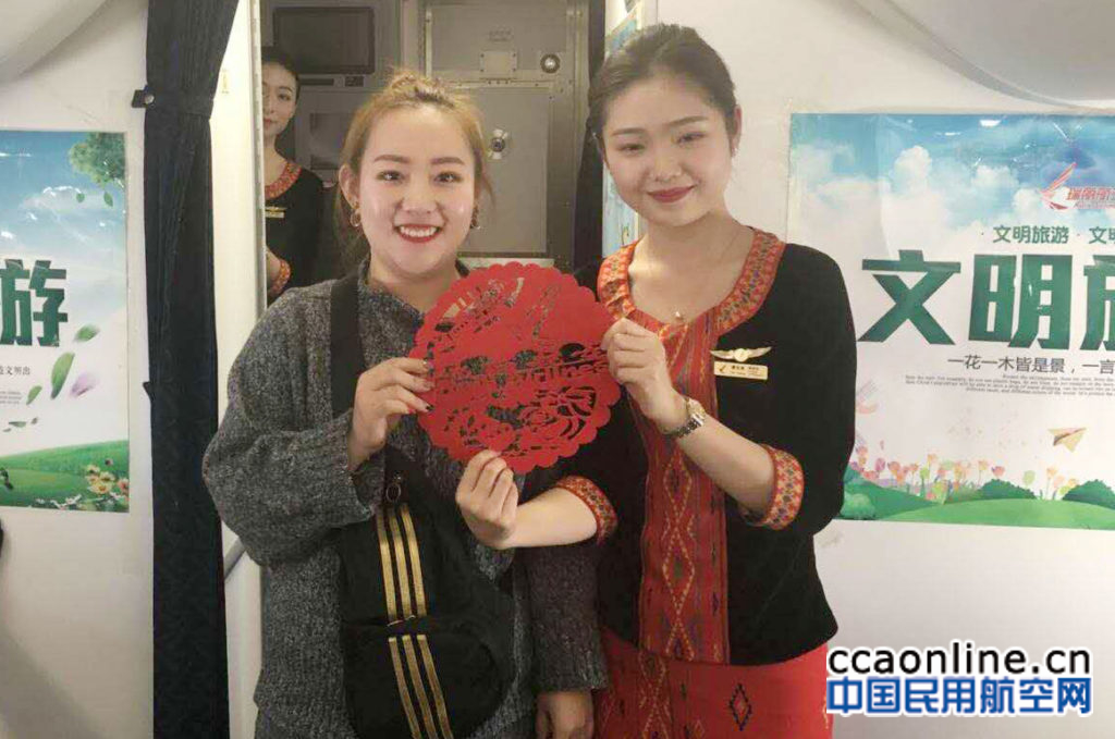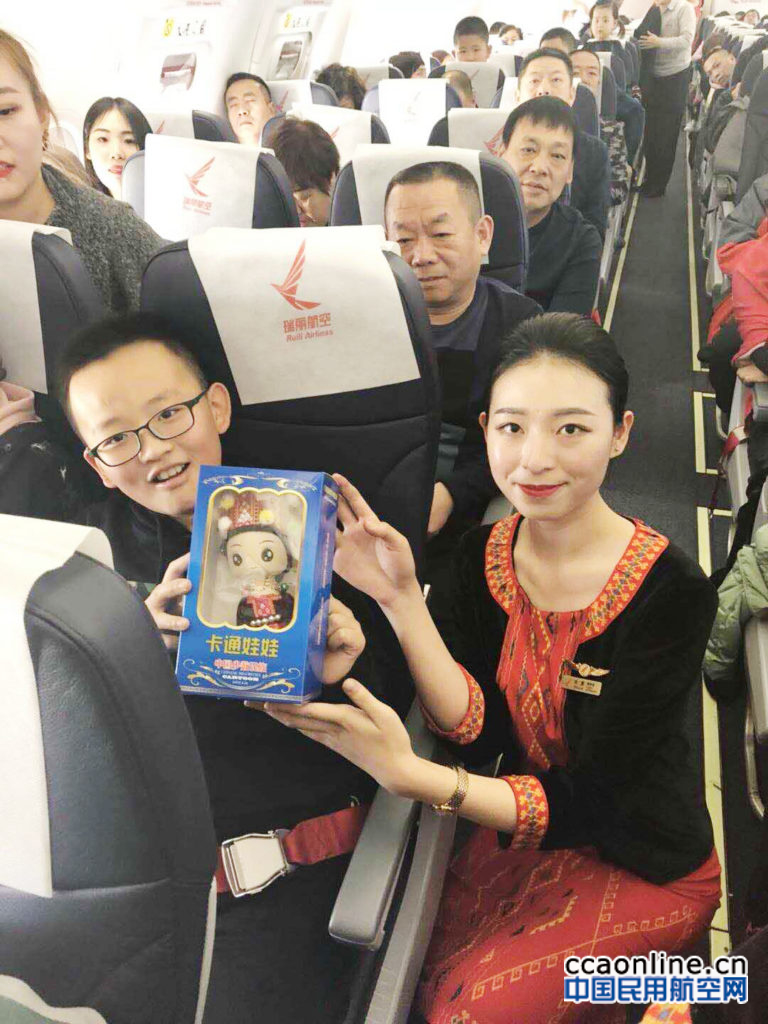 在春运的航班上,瑞丽航空还特别举办了客舱活动,在张贴这窗花春节氛围浓郁的客舱里,机组为春节回家的旅客送上新春的礼物,幸运的旅客获得了瑞丽航空送出的窗花等春节礼物,小朋友旅客则获得了独具民族特色的少数民族玩偶礼物。在万米高空的客舱里,让旅客度过了一个难忘的空中春节旅程。