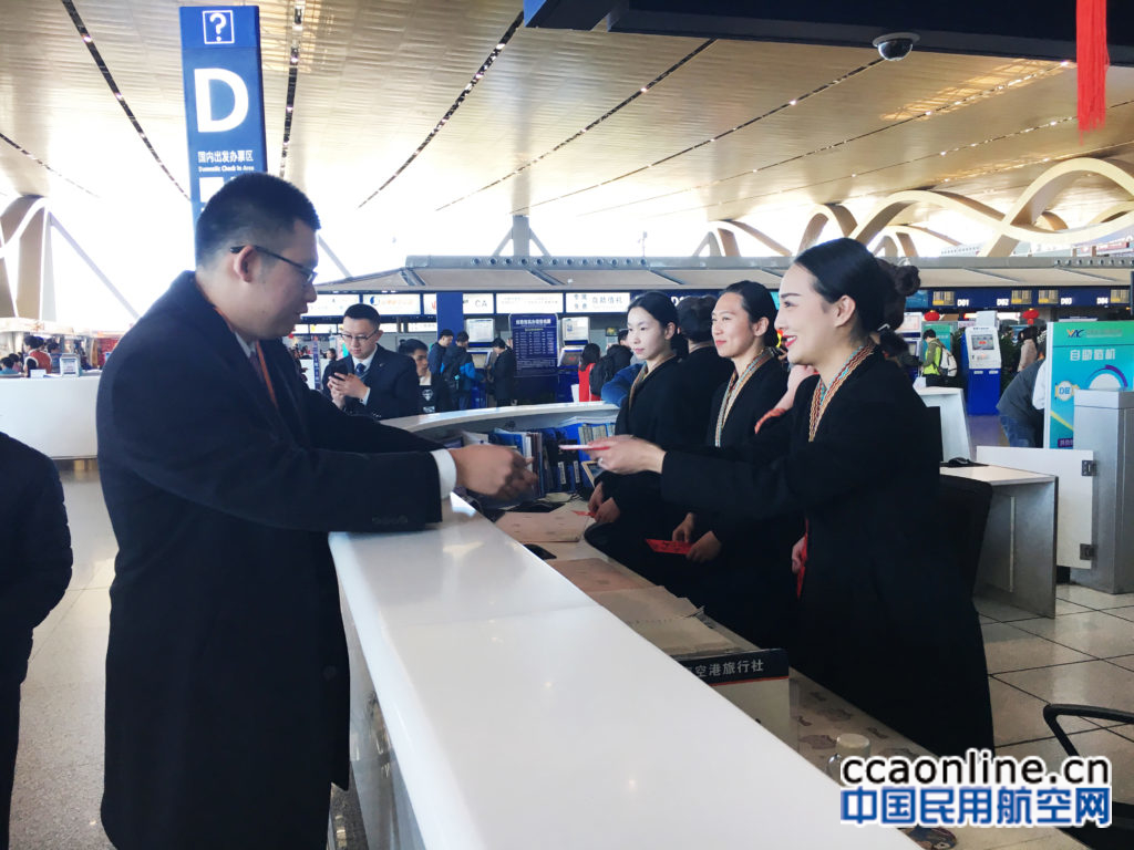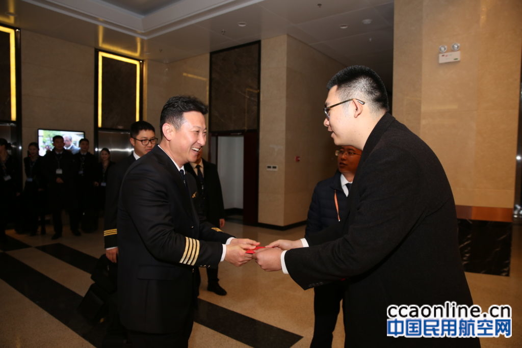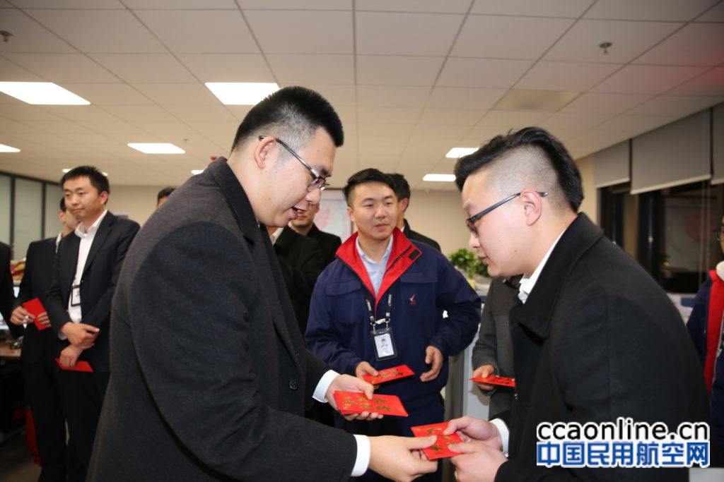 新年伊始,董世杰总裁、马占炜董事长,携公司领导向战斗在旅客运输一线的员工拜年,并致以新春的祝福,代表公司为辛勤工作的机组(飞行员、乘务员、安全员)、维修工程人员、地面服务人员、热线及柜台值班员工每人都送上了新春红包,并致以春节的祝福。