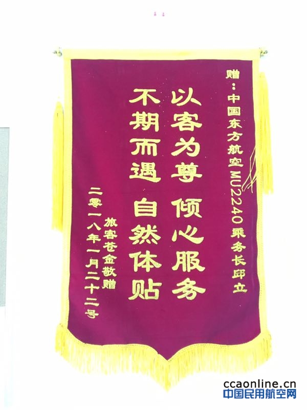 事情还要从2个月前的一个航班说起,1月20日,苍先生搭乘了从银川飞往西安的MU2240航班,航程虽然只有短短的1个小时,但是在航班中他感受到了乘务长邱立和乘务员谢龙无微不至的照顾和热情周到的服务。从上机时的亲切问候到下机时的温馨提醒,服务用品的精心准备、旅客餐饮的提供、乘务员亲切友好的整体风貌等等细节无一不体现了乘务组的优质服务,展现了东航人的真挚和热忱。虽然他多次搭乘东航的航班,但此次的乘机体验让他印象之深,难以忘怀,因此,特意制作了一面锦旗,并邮寄过来,表达他对东航江西乘务组的赞赏之情。