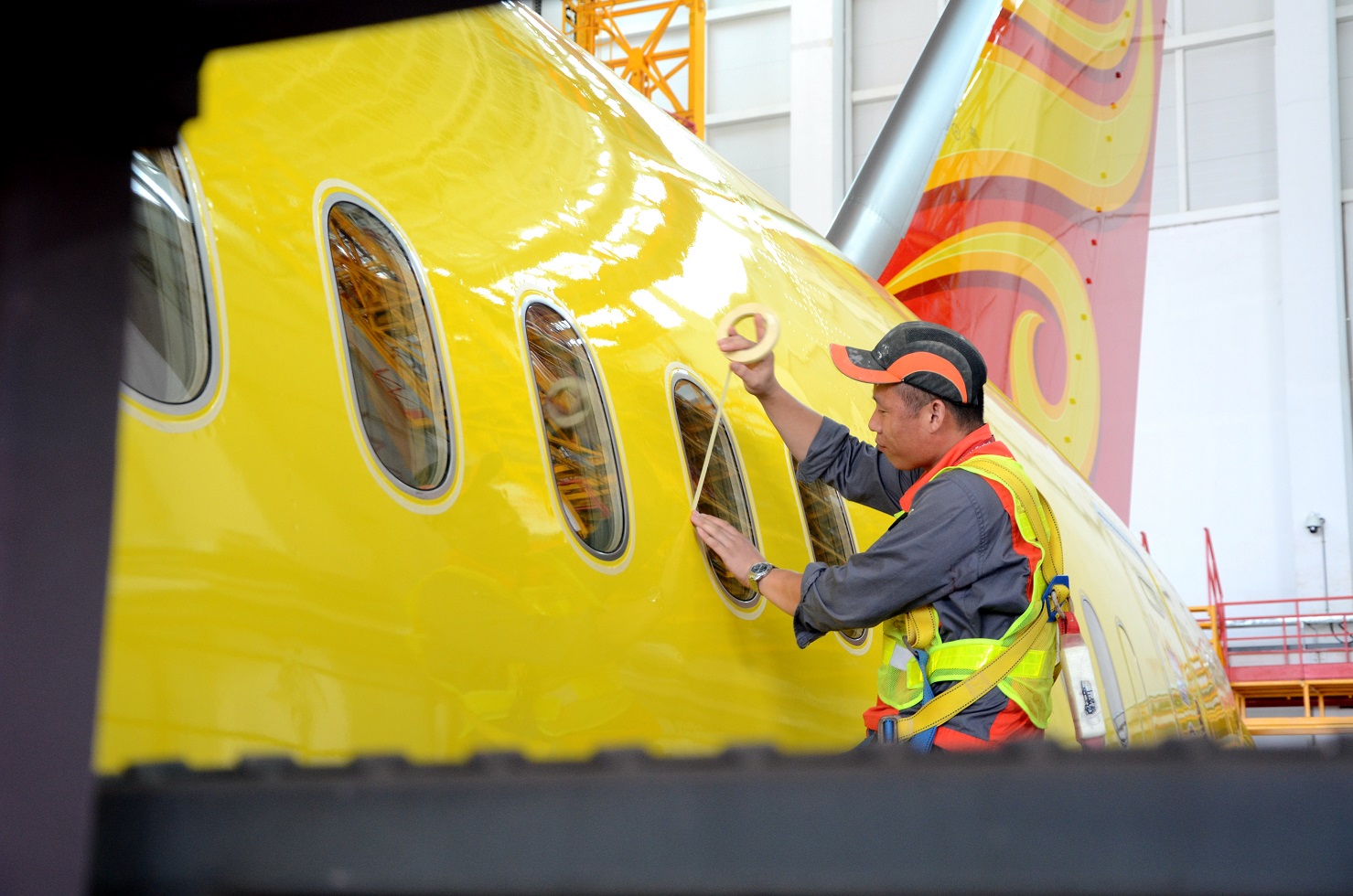 飞机在贴膜前需要对机身各个部位进行定位,确认模板的粘贴位置。这位机务正在手拉胶带,仔细确认位置。