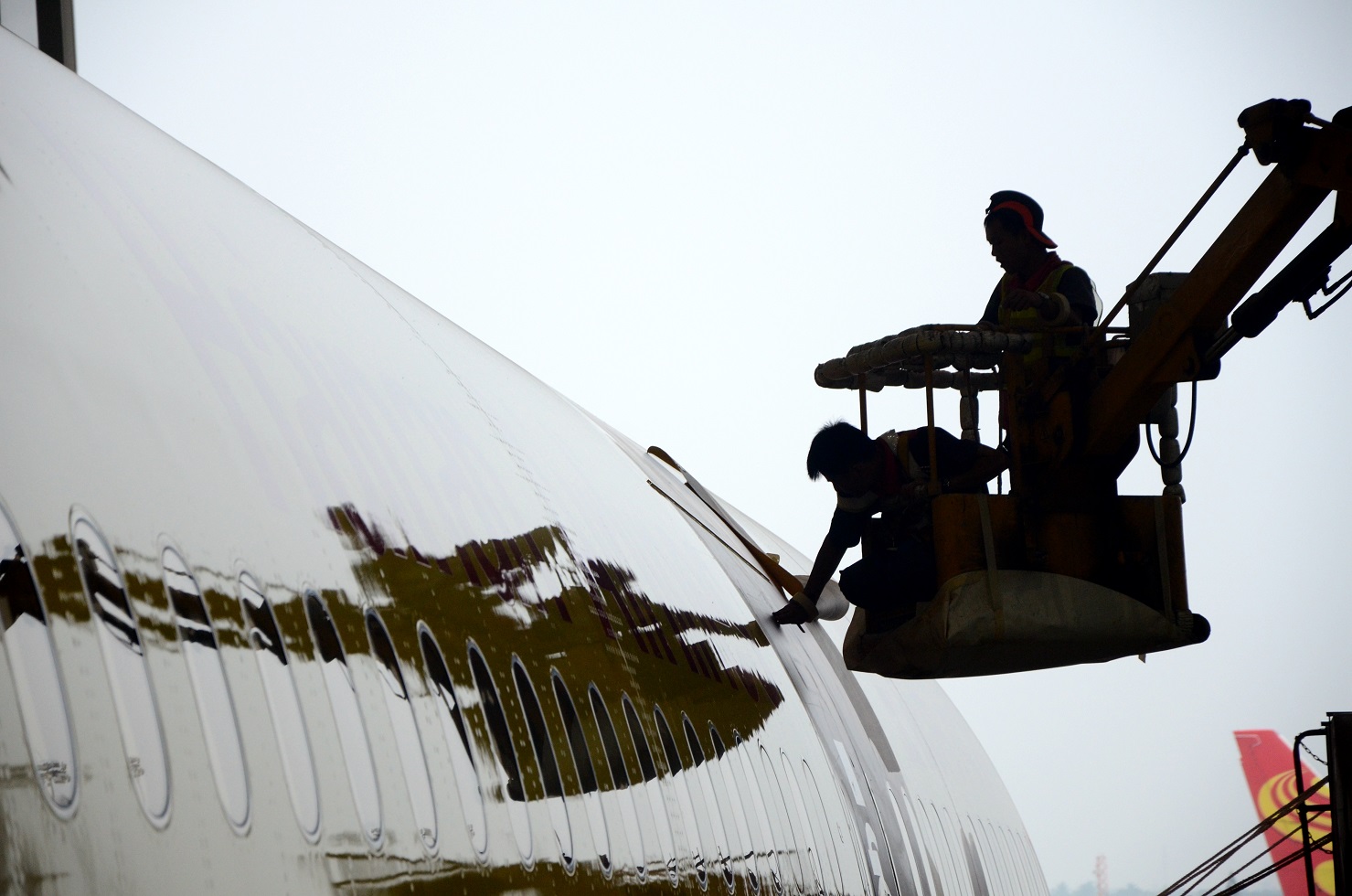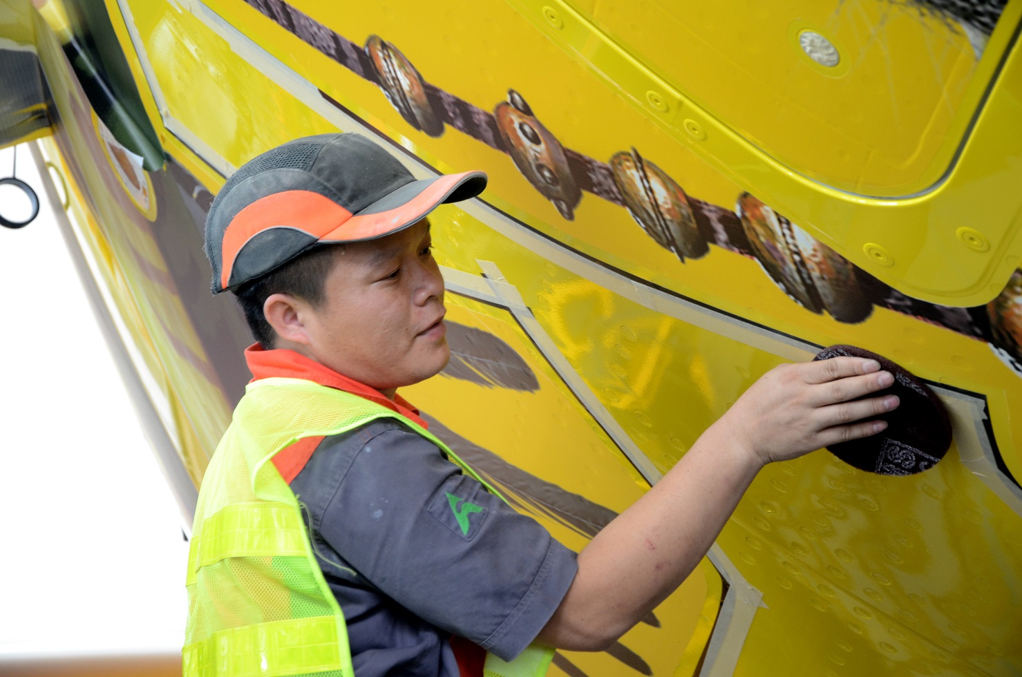 大面积的机身贴膜,最重要的是相邻两块膜之间的搭接。每一个细节都要十分到位,不然会影响后期的美观程度。瞧,这位机务正在专注地拼贴着,不放过每一处小细节。